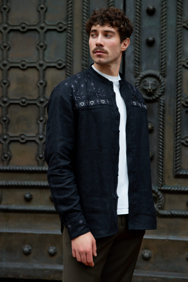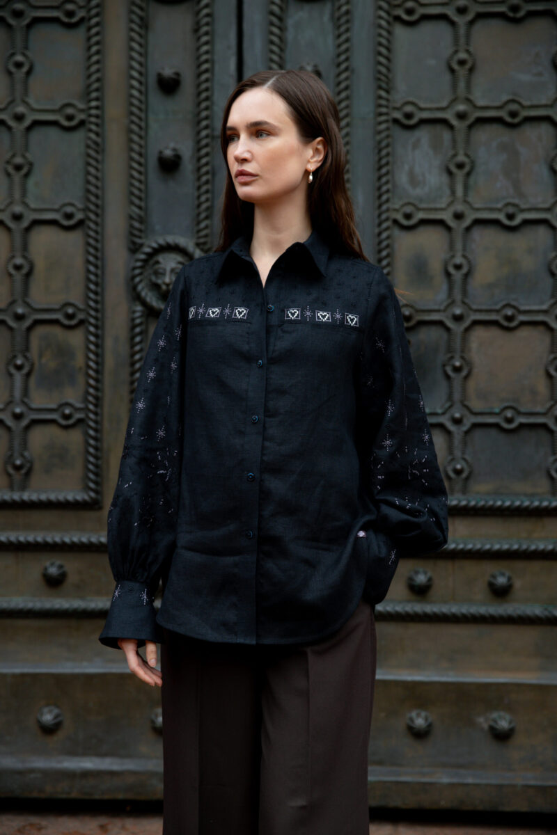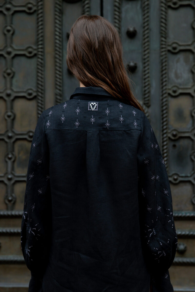 Орнамент на сорочці, графіка та дрони, нагадують зірки. Виріб створювався як сучасний оберіг, що наділяє вишиванку сучасними сенсами.