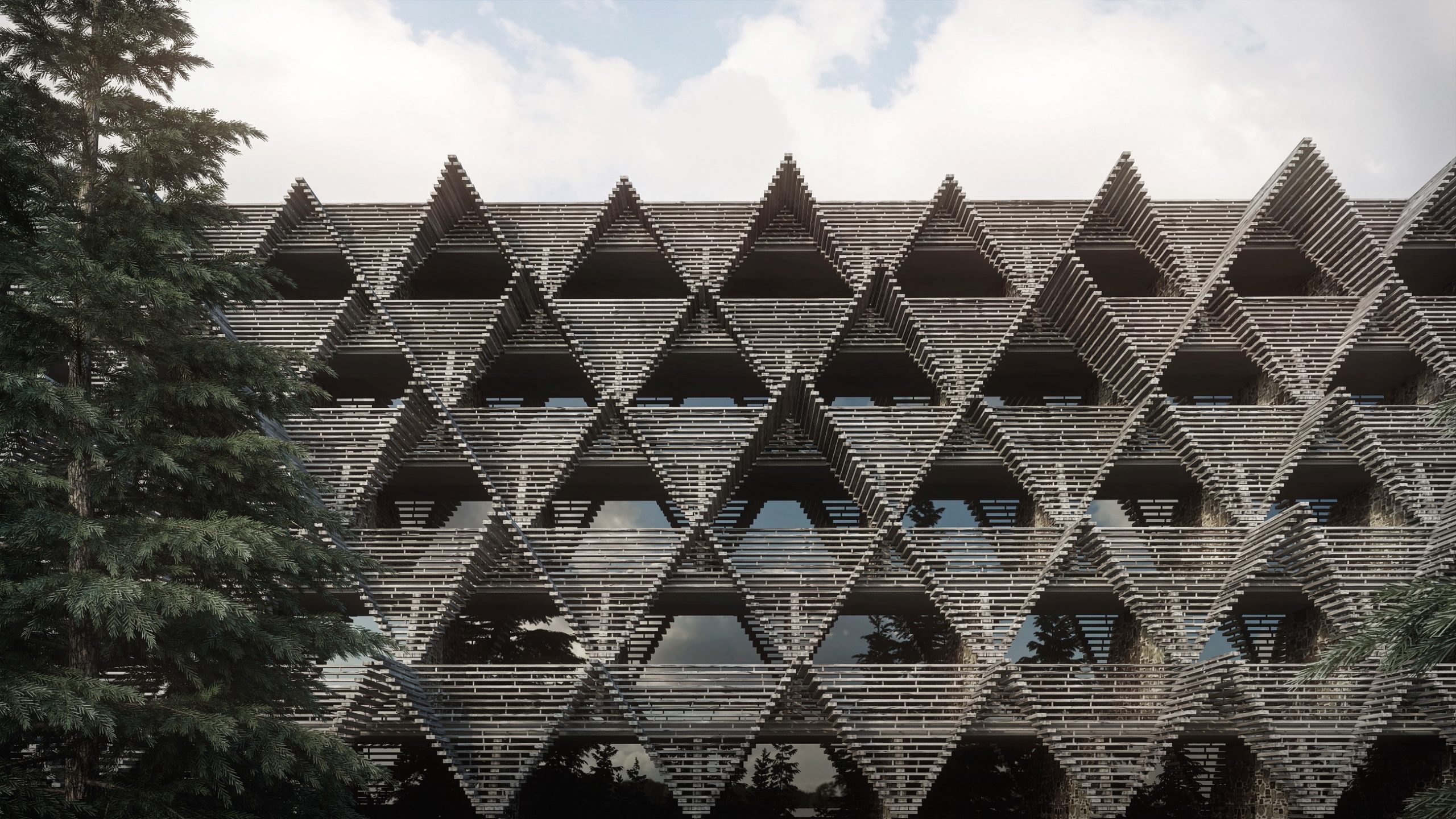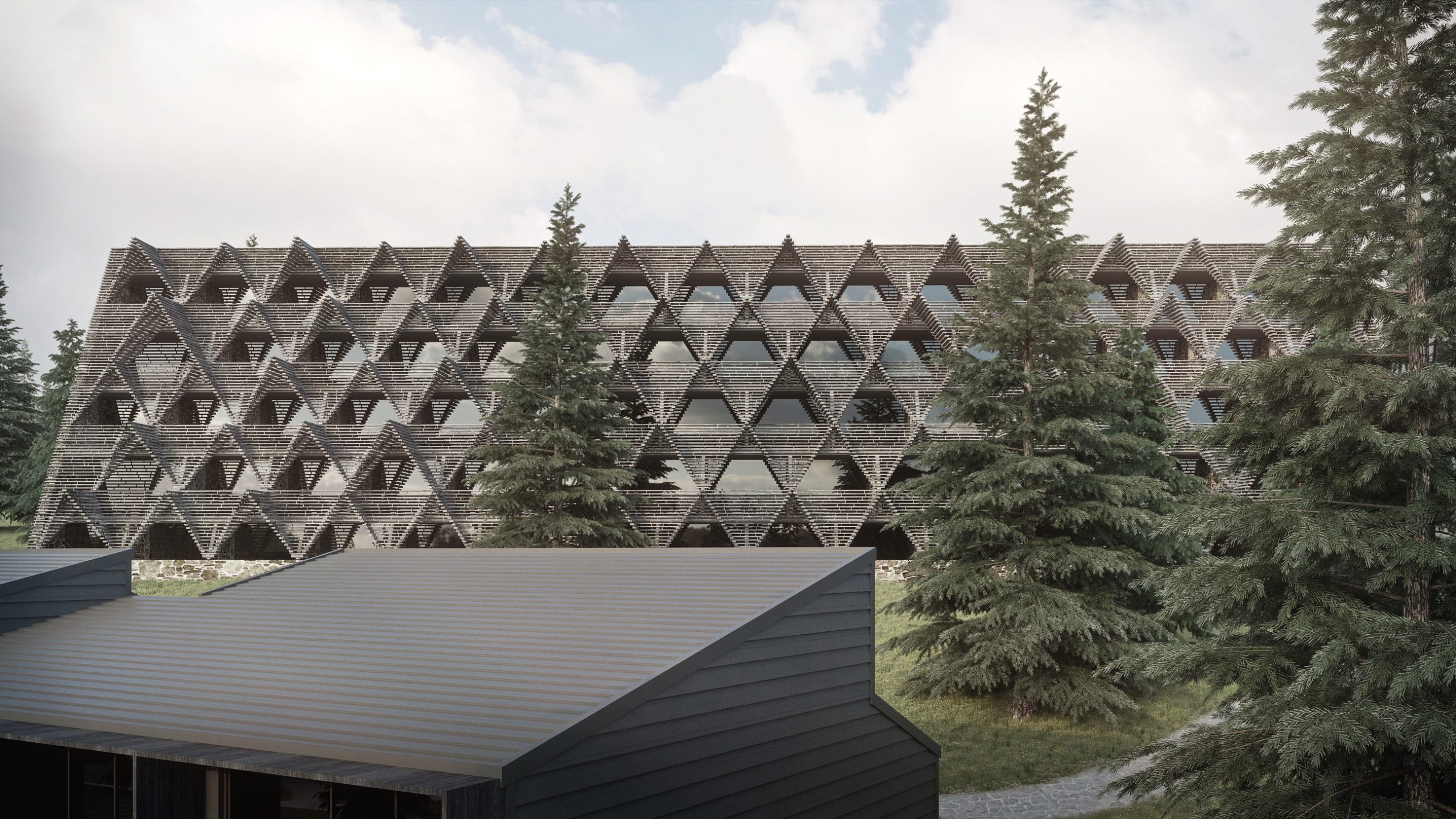Enota Architects прагнули «з’єднати непоєднуване» таким чином, щоб А-подібні частини фасаду візуально трансформувалися в дерев’яний двосхилий дах. Вільно укладена та незахищена деревина ніби зливається з навколишнім лісовим ландшафтом.