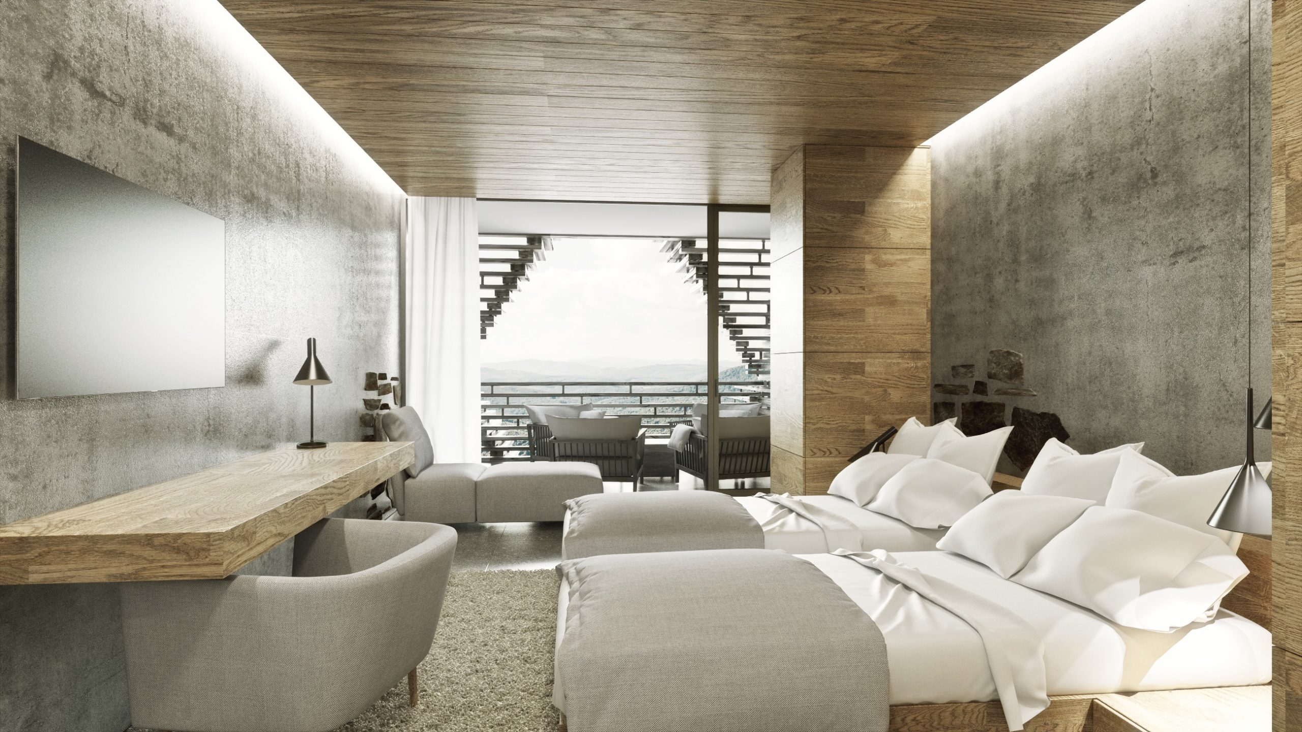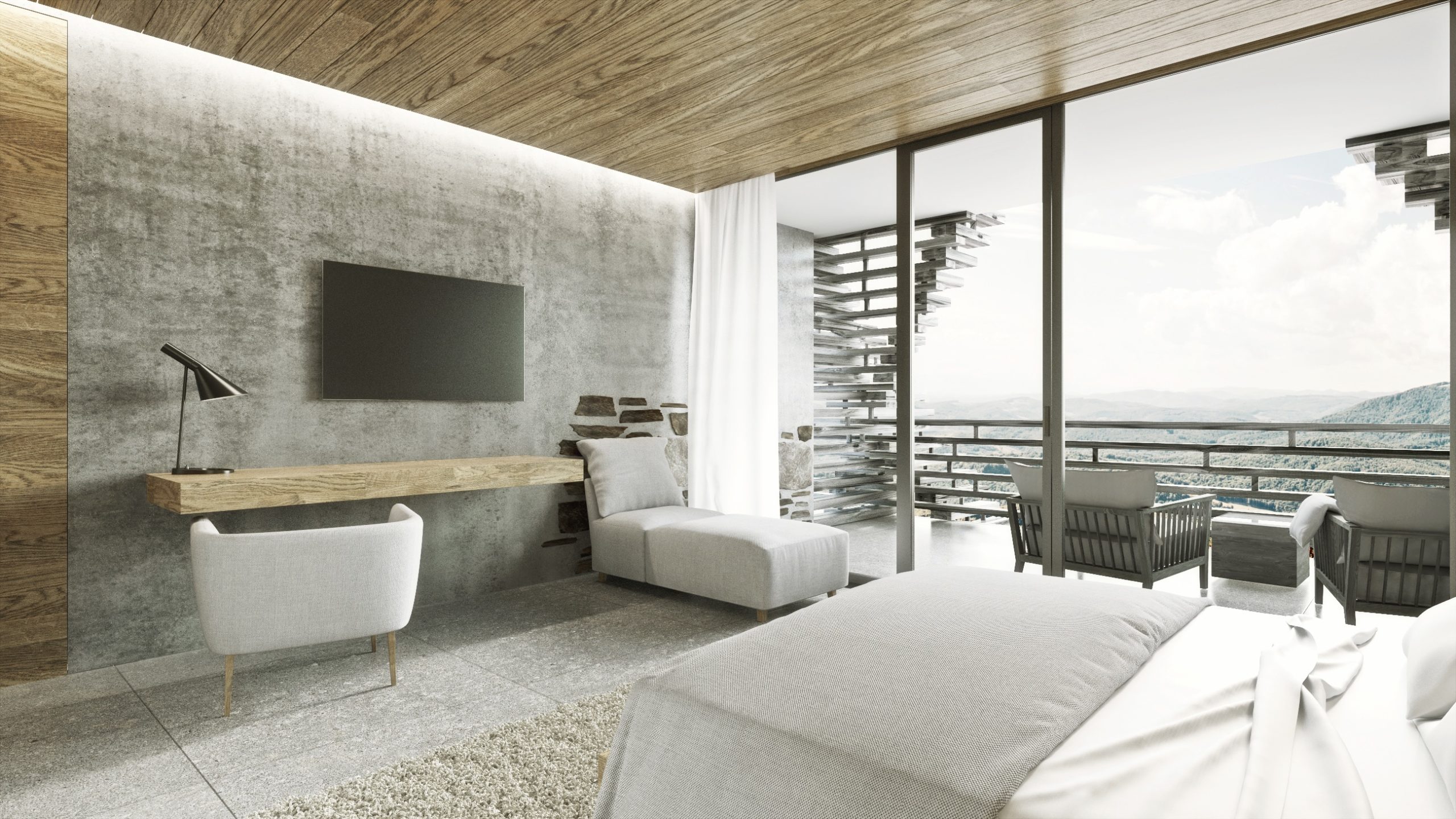 Інтер’єр готелю всередині відображає складну структуру дерева, а просторі публічні приміщення, як от конференц-зал, відкривають для відвідувачів мальовничі гірські і лісові пейзажі. Крім того, природне освітлення візуально збільшує простір нежитлової частини будівлі.
