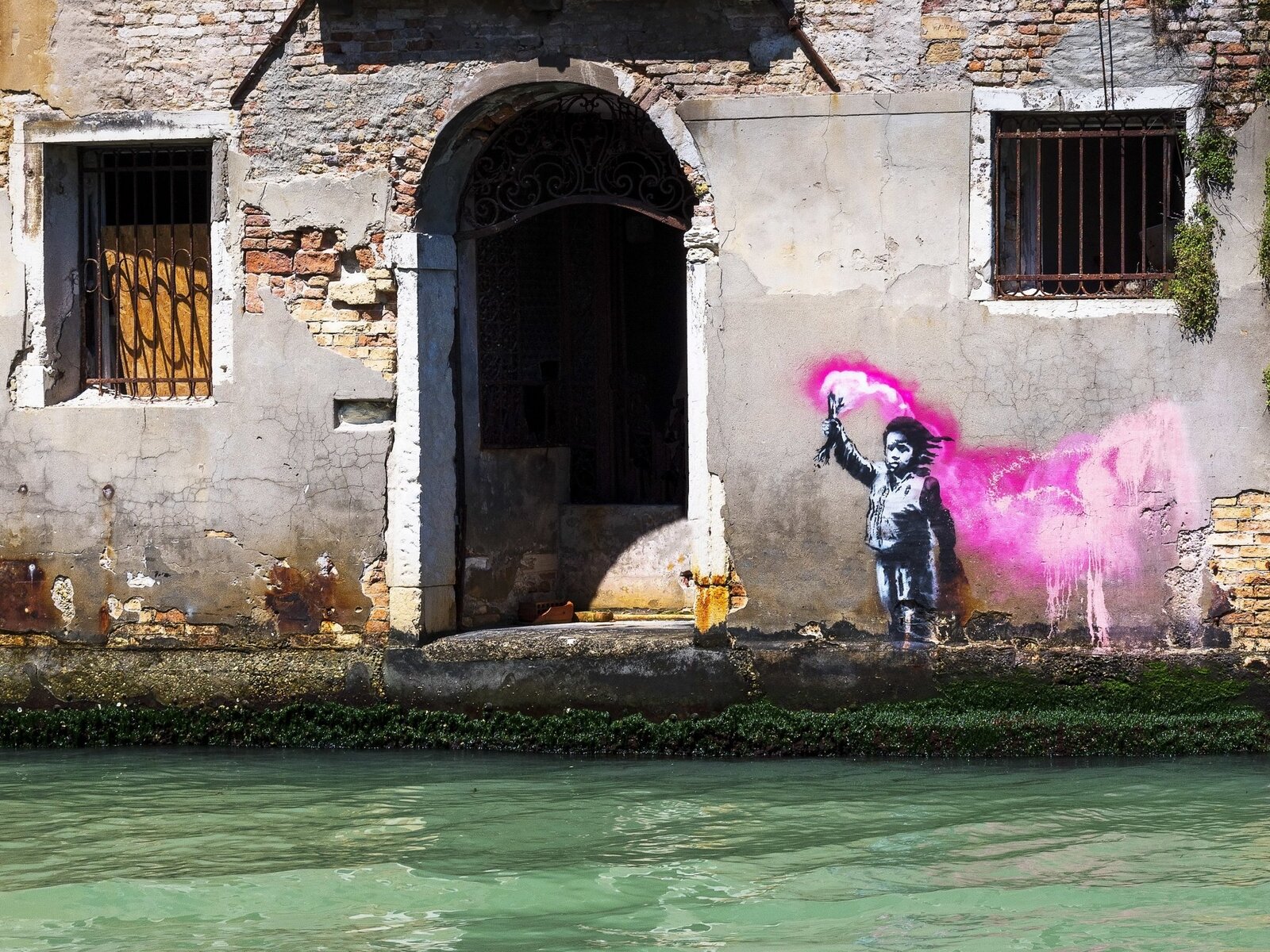 Мурал зображує дитину у рятувальному жилеті з рожевим димовим факелом у руках. Це один із лише двох творів, офіційно створених Бенксі в Італії. Унаслідок багаторічного впливу припливів і ерозії від солоної води було втрачено приблизно 30% зображення.
