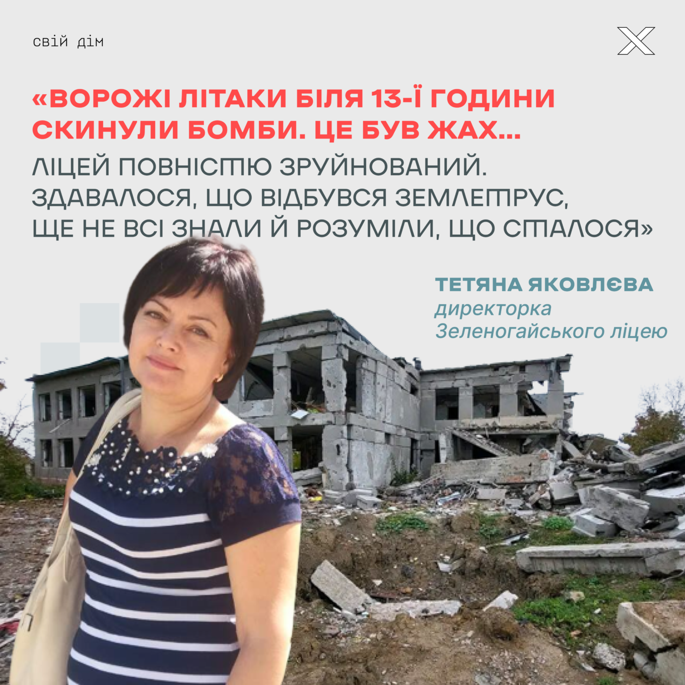 “24 лютого 2022 року війська російської федерації вторглися на наші території. Ми знали, що зі сторони Херсону суне ворог. Але навіть уявити не могли, які жахи на нас чекають”, – розповіла проєкту “Свій дім” Тетяна Яковлєва, директорка Зеленогайського ліцею.