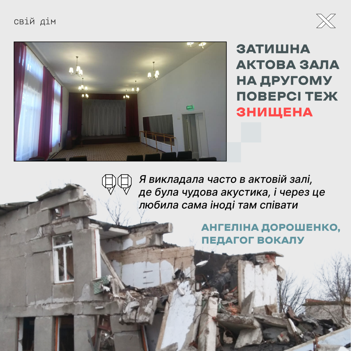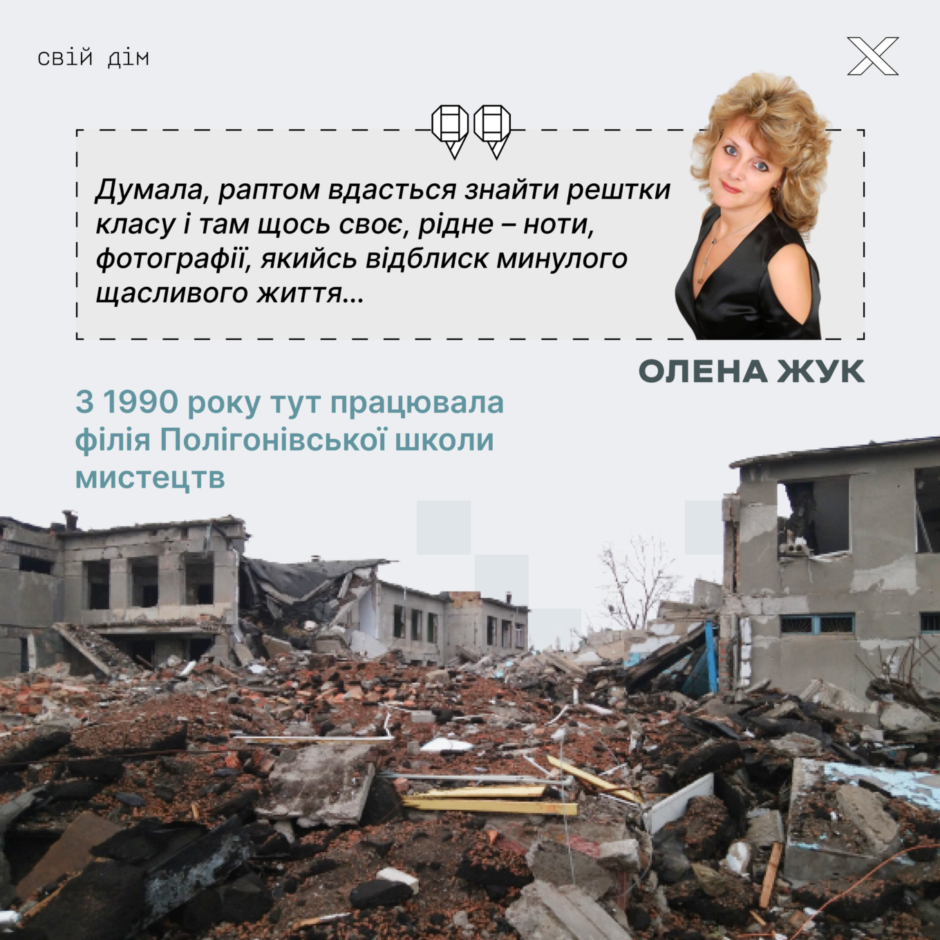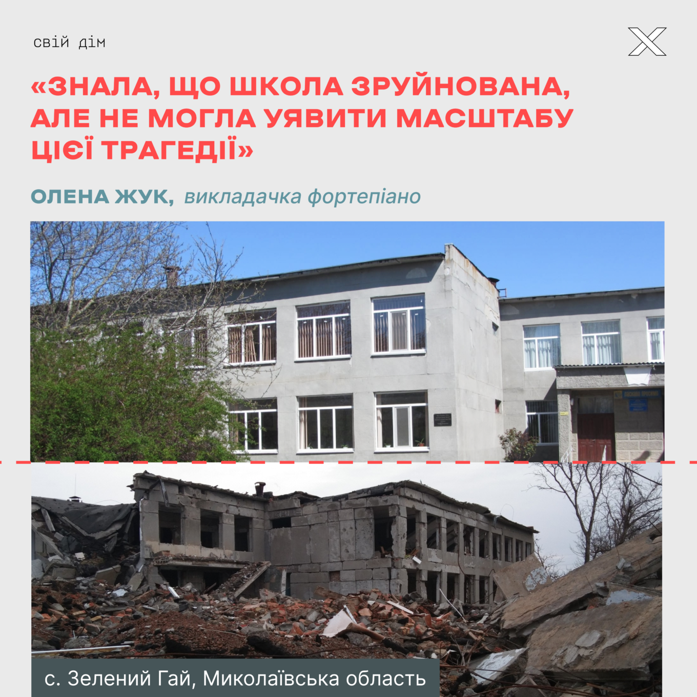 “У селі Зелений Гай з 1990 року була наша філія, ми займали декілька кабінетів у школі. Я не була у селі у цей момент, тому що живу у Миколаєві та їздила туди тільки на роботу. Це страшна трагедія, досі не можемо повірити”, – розповіла проєкту “Свій дім” викладачка фортепіано Олена Жук, яка працювала тут 34 роки.