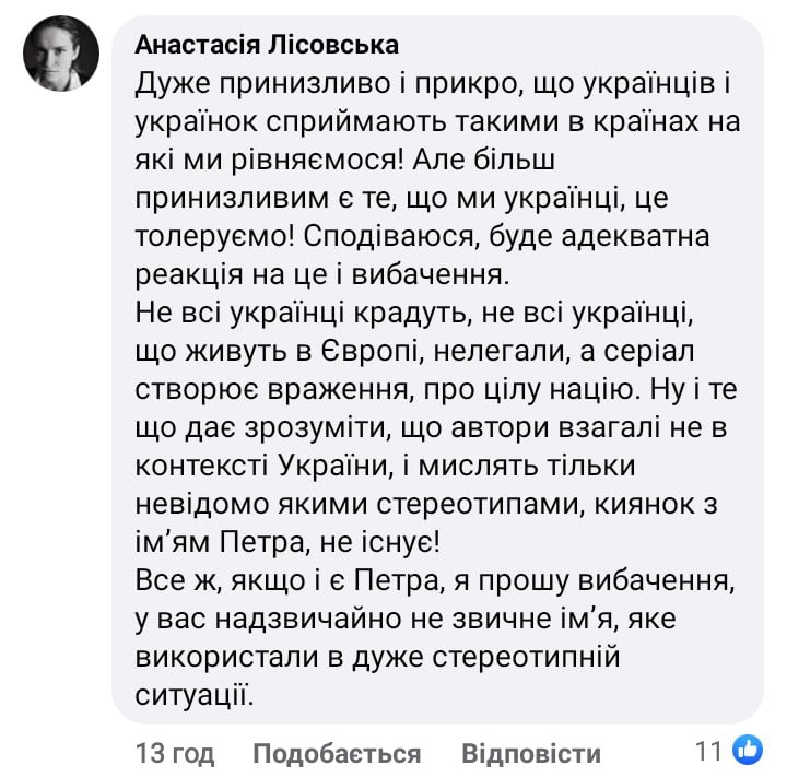 “В “Емілі в Парижі” маємо карикатурний образ українки, який є неприйнятним. А з іншого боку – ще й образливим. Такими бачитимуть українців за кордоном? Які крадуть, хочуть отримувати все безкоштовно, боятися депортації?”