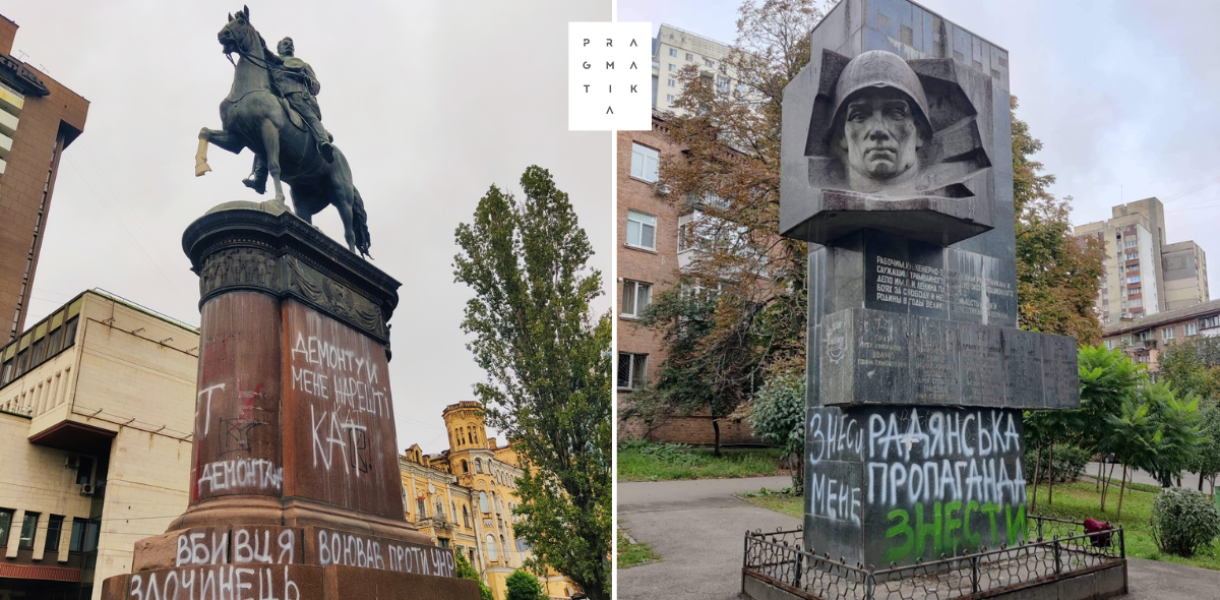“Знеси мене повністю”. У Києві почали розмальовувати російські пам’ятники закликами демонтувати їх