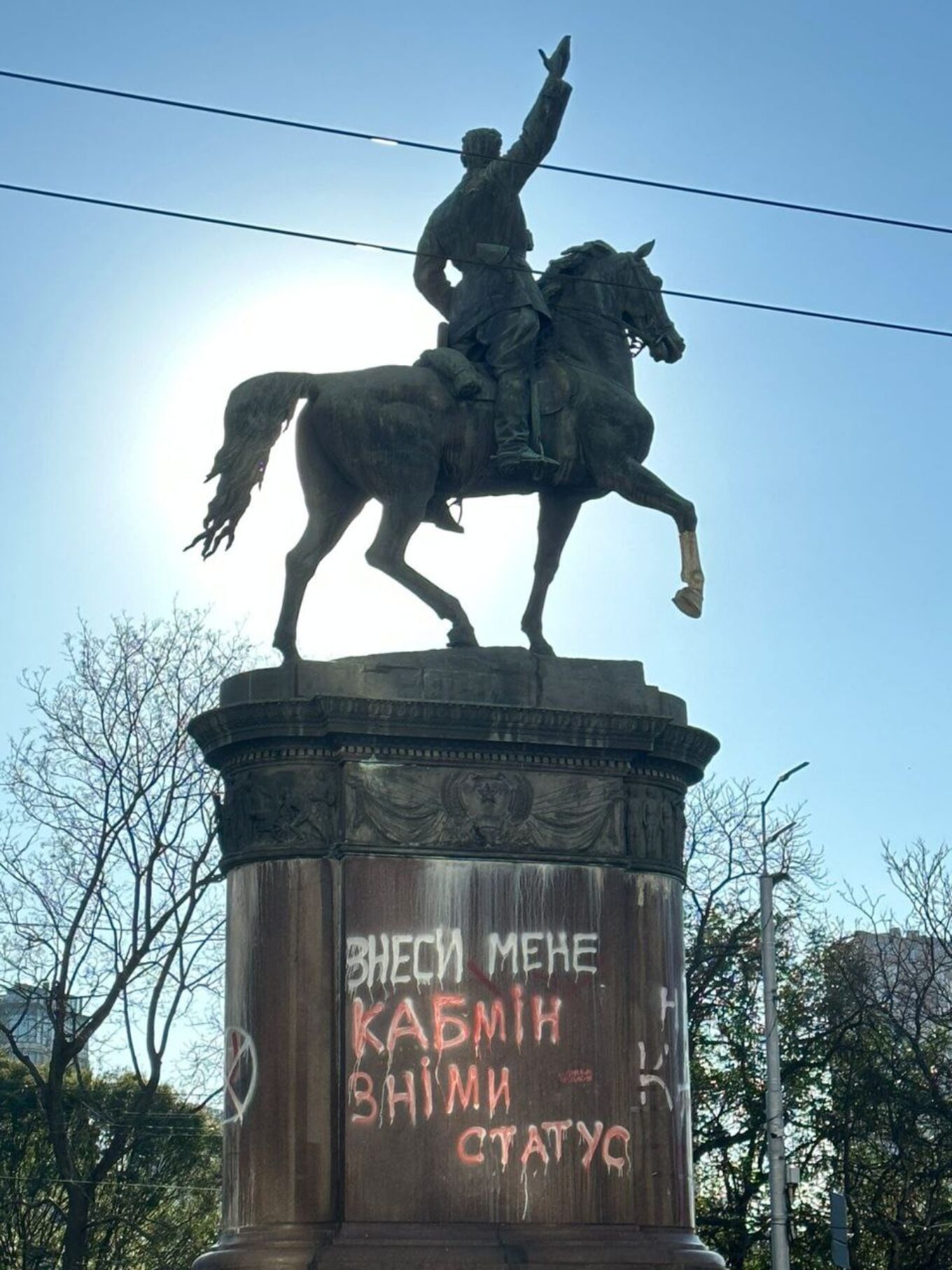 Водночас на памʼятнику Щорсу, що знаходиться на бульварі Шевченка, активісти залишили напис: “Знеси мене. Кабмін зміни статус”. Зазначимо, обидва монументи перебувають у Переліку обʼєктів культурної спадщини. Тільки після виключення з переліку, їх можна буде законно знести.