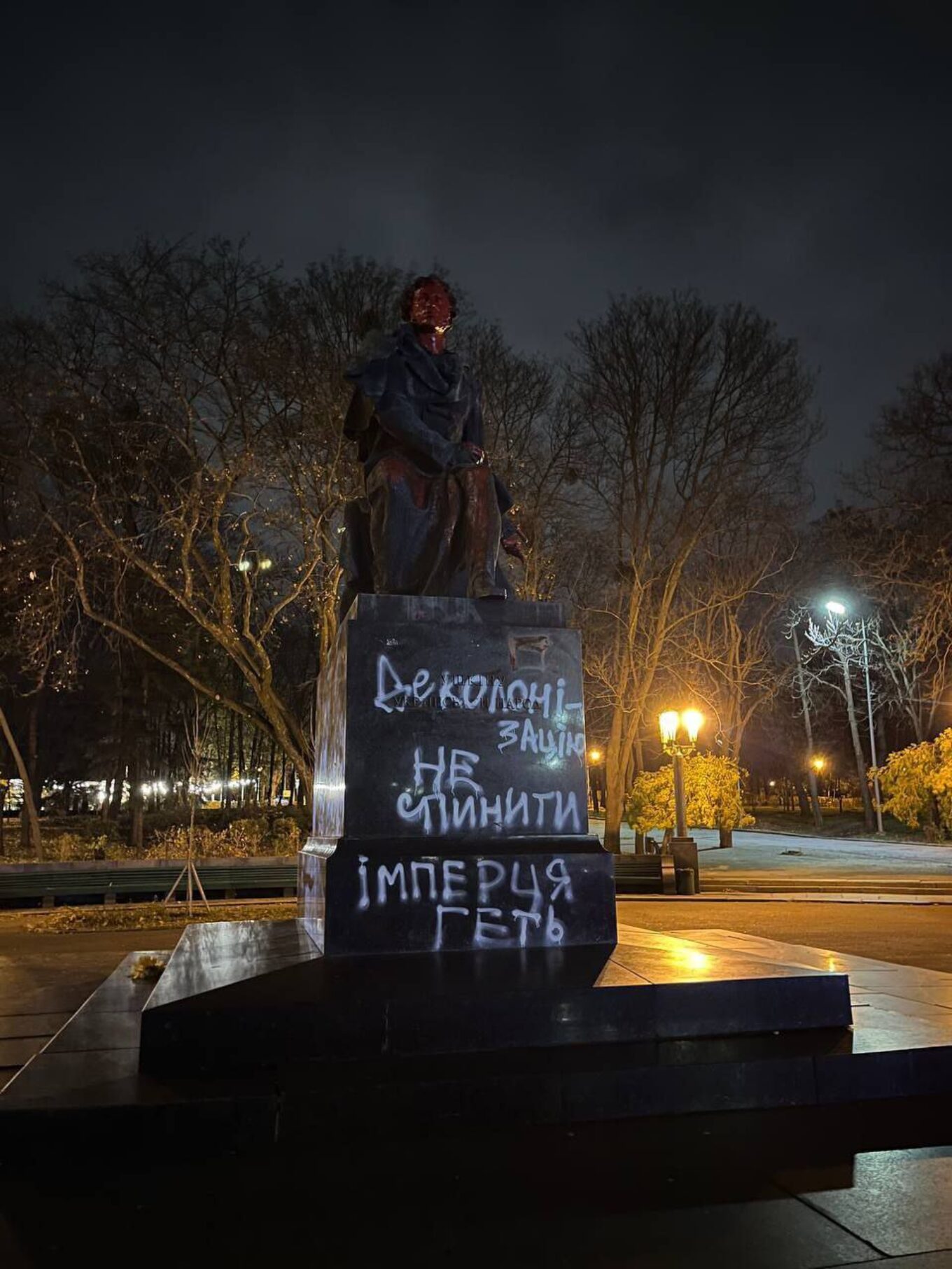 Так, на пам’ятнику російському поету в парку імені Багряного, який напередодні завісили маскувальною сіткою, з’явився новий напис. На ньому йдеться: “Деколонізацію не спинити. Імперця геть”. Крім того, обличчя Пушкіна залили червоною фарбою.