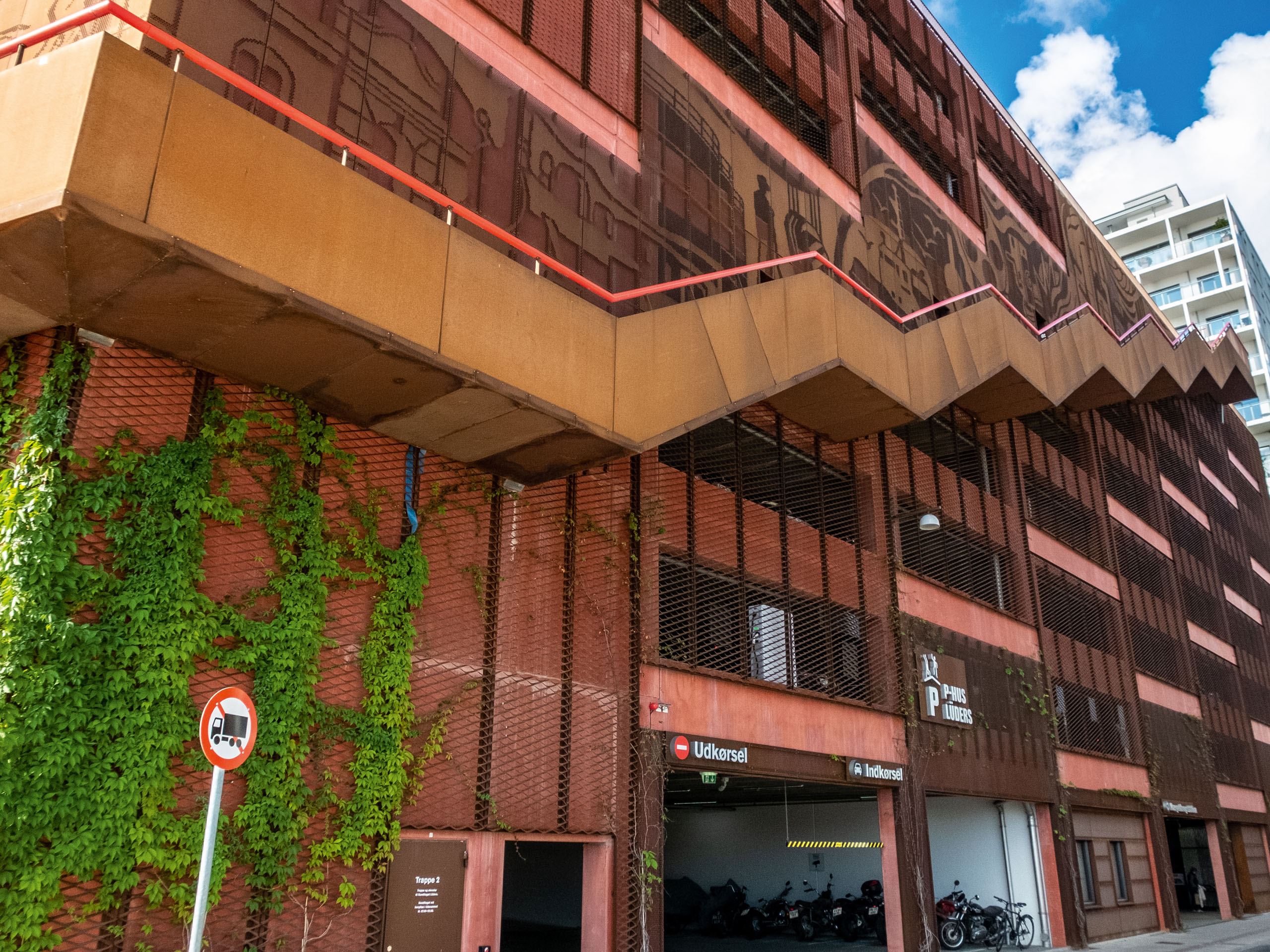 Поскольку мастер-план района предполагает плотную застройку, архитекторы используют крыши зданий не только как зеленые сады или солнечные станции. Konditaget Lüders можно назвать автопаркингом будущего. Это первая автостоянка в Дании с активным городским пространством на крыше. Проект JAJA Architects был реализован в 2016 г. Фасад многоуровневого паркинга оформлен перфорированным металлом со встроенными контейнерами для вьющихся растений.