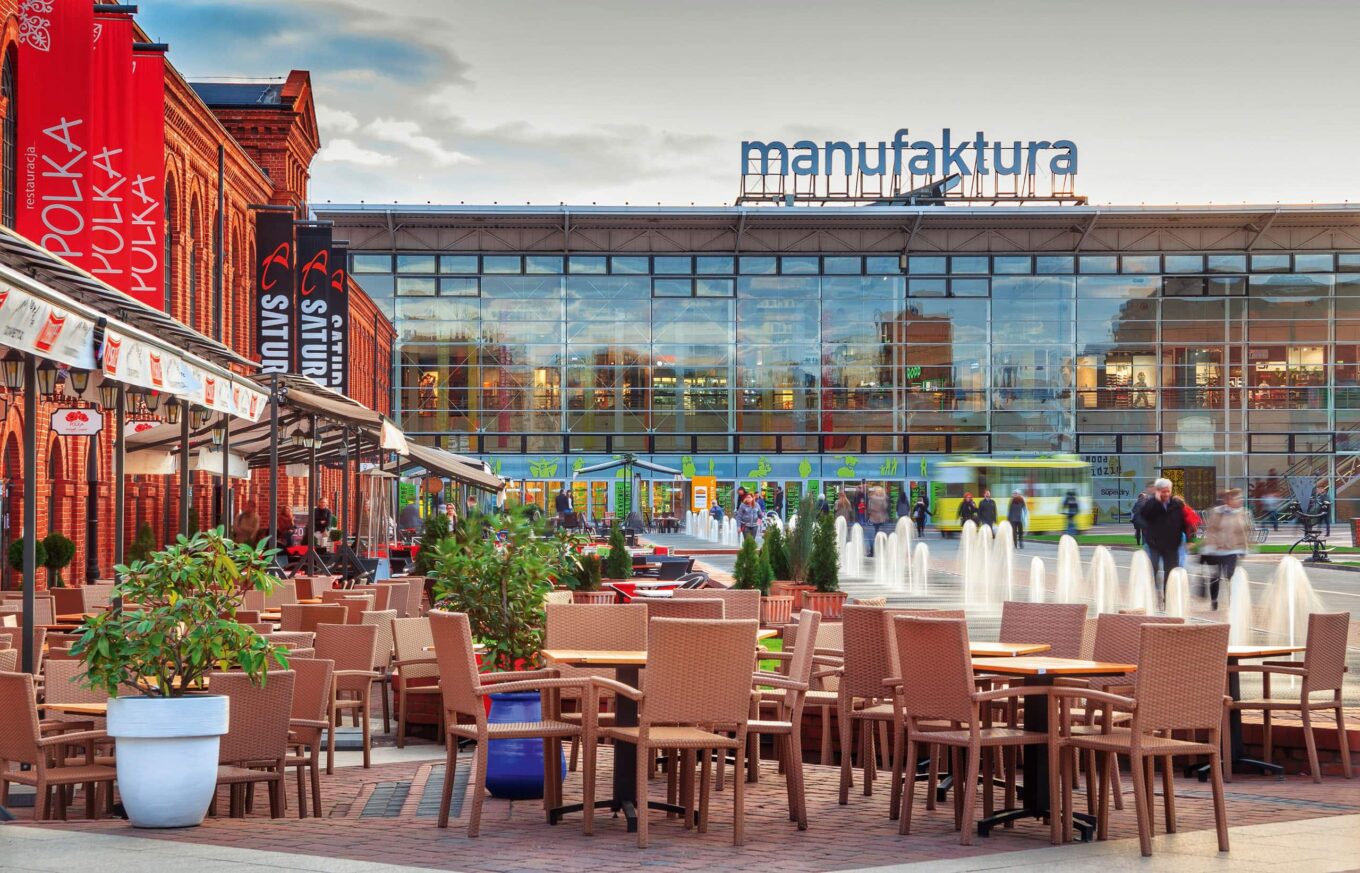 Територія комплексу Manufaktura в Польщі включає простір для різноманітних фестивалів і концертів на свіжому повітрі. Її площа з фонтанами — чудова рекреаційна зона.