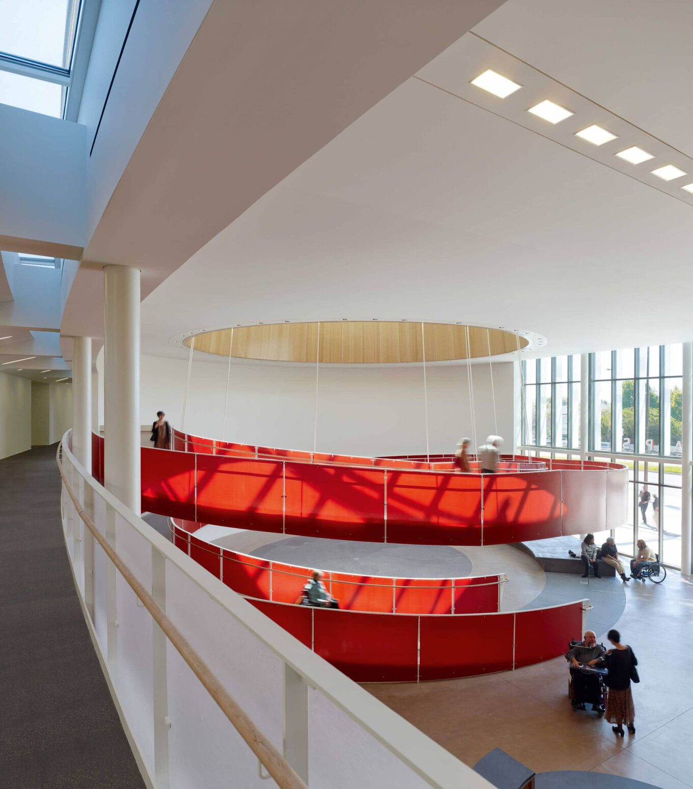 Для того, щоб слабозорі легко знаходили шлях, були використані акустичні орієнтири, висококонтрастне оздоблення стін, текстуровані підлоги. Керувати ліфтами та відчиняти двері можна дистанційно, за допомогою смартфона. Тут немає сходів, а піднятися на другий поверх можна яскраво-червоним спіральним пандусом, який є фокусним об’єктом центрального атріуму.