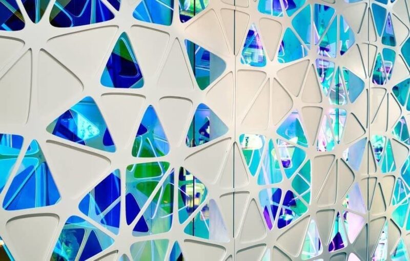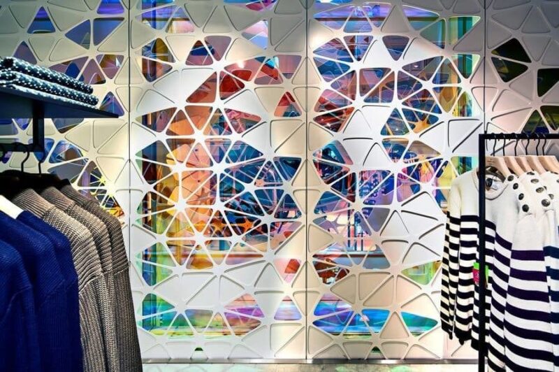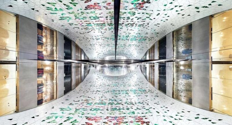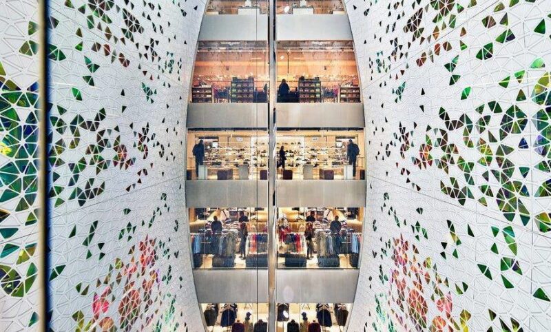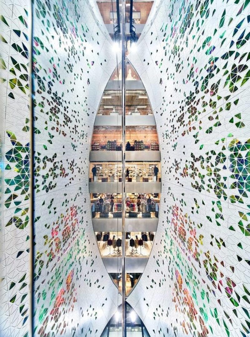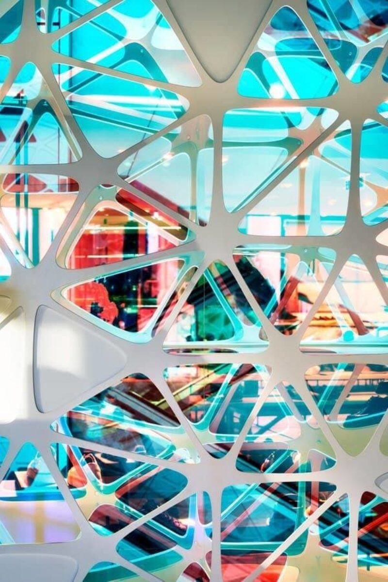 Поэтому нынешние владельцы торгового комплекса пригласили архитекторов студии UUfie с предложением создать новый проект пространства атриума. За 4 года они разработали и реализовали дизайн футуристических полотен с геометрическими цветными лепестками, которые визуально оживляют центральную часть здания с первого по девятый этаж.