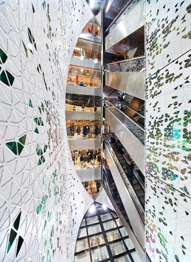 Так комбинация двумерных изогнутых полотен не только обеспечивает прихотливую игру цвета, но и полностью преображает новый атриум, который теперь, по мнению архитекторов, вполне «соответствует знаменательному статусу универмага».