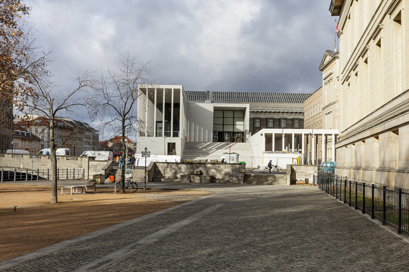 Узкое здание с тонкими белоснежными колоннами было вдохновлено знаменитым эскизом Фридриха Вильгельма IV для «культурного акрополя» и перекликается с форумной архитектурой придворного королевского зодчего – Фридриха Августа Штюлера.