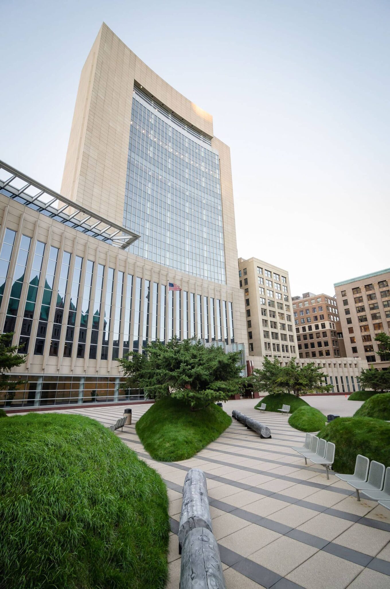 Лаконичные, но такие эффектные выпуклые капли на площади Minneapolis Courthouse Plaza в американском Миннеаполисе — это дизайн студии Martha Schwartz Partners, продиктованный отсылкой к ледниковым друмлинам. Подобные холмы эллипсовидной формы образовывались по следу ледника. Курганы, созданные Мартой Шварц, органично перекликаются с архитектурой здания нового Федерального суда от Kohn Pedersen Fox Associates. Несмотря на подражание древним прототипам, земляные друмлины, встроенные в мощение из сланца с регулярным полосатым рисунком, выглядят ультрасовременно.