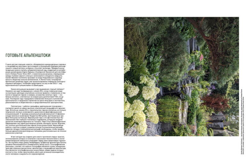 У меня для вас хорошая новость: обозреватели международных садовых и ландшафтных выставок прогнозируют в ближайшем будущем реинкарнацию и новый всплеск интереса к mountain landscape. Предвестником тенденции можно считать натуралистический сад, созданный в коллаборации дизайнерами Карли Кершоу и Екатериной Засухиной для сентябрьского Chelsea Flower Show 2021, с живописными ручьями, струящимися между глыбами черного сланца и зеленоватого слюдяного кварцита. Garden Between Continents произвел на жюри Королевского садоводческого общества сильное впечатление. А Лилли Гомм, популярная британская дизайнер садов, уже проанонсировала очередной культурно-садовый прецедент, пообещав представить на шоу в мае 2022 г. сад, вдохновленный путешествием по Швейцарии.