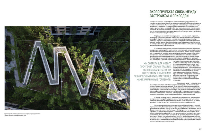 И вот сегодня мы созрели для нового прочтения старых практик, использование которых в сочетании с высокими технологиями и экспериментаторской смелостью открывает перед нами заманчивые горизонты. Не случайно ведь Дэвид Лезербарроу, профессор архитектуры Школы дизайна Пенсильванского университета, автор книги «Топографические рассказы», считает, что именно топография является полем, объединяющим две смежные дисциплины: архитектуру и ландшафтную архитектуру. Они являются топографическими искусствами, общая задача которых состоит в том, чтобы приспособить место для успешной жизнедеятельности человека и выразить его мировоззрение.