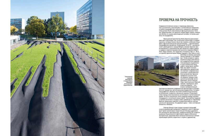 Сегодня с рельефом все чаще работают на городских площадях, отступая от плоского архетипического образа. Это же прекрасно, когда можно поваляться на мягком травяном холме прямо в историческом центре города. Масштабная работа с рельефом — это в том числе проектирование мостовых экопереходов через автомагистрали. Это, как я уже упоминала, создание террас и зеленых крыш. Словом, рельефный язык дизайна — отдельное измерение, безграничное пространство для свежих, инновационных образов.