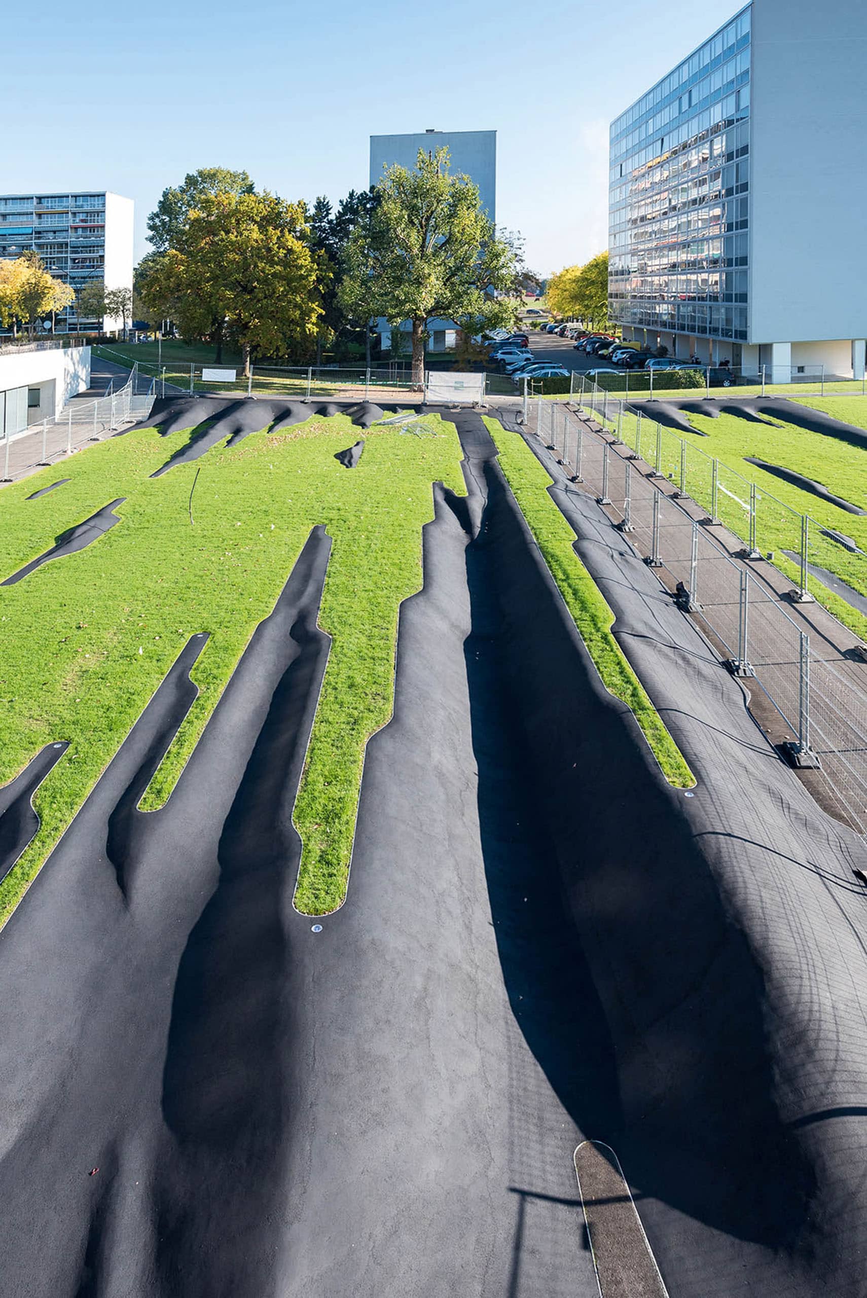 Французский архитектор Жиль Брюссе рассматривает весь мир вокруг как гигантскую скульптуру и создает проекты, которые можно было бы назвать слиянием ленд-арта с функциональными дисциплинами, — архитектурой, ландшафтным дизайном, инженерией. В 2014 г. муниципалитет швейцарского города Мейрин заказал Брюссе проектирование и строительство арт-объекта в парке, рядом с недавно отремонтированной школой в квартале Meyrin Park. Надо сказать, что город был построен в 60‑х гг. XX в. по проекту архитекторов Жоржа Аддора и Луи Пайо в соответствии со всеми канонами школы Баухаус и Ле Корбюзье. Чтобы возвести здесь стройные ряды равновысоких модернистских зданий, планировщики выровняли в ноль холмистый ландшафт в предгорьях хребта Юра. Но серия плоских однообразных дворов уже не отвечает современным понятиям о качественном благоустройстве.
