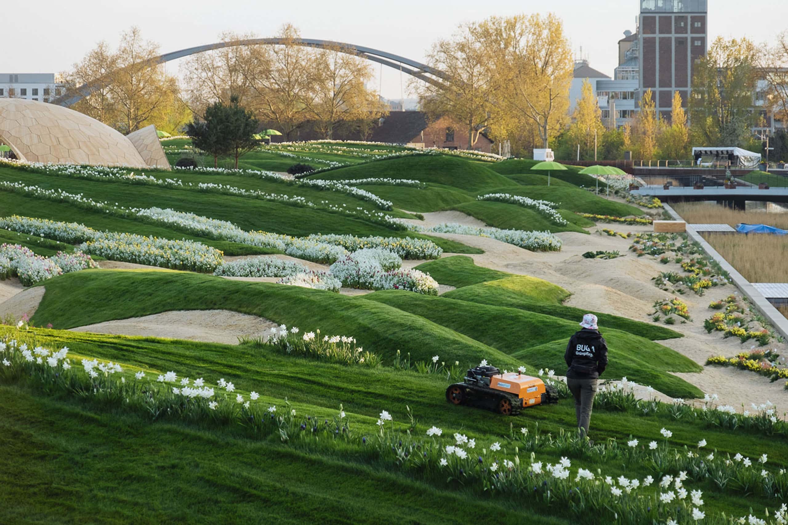 Программа создала модель трехмерного пейзажа с волнистыми дюнами. Все, что нужно было — перенести его в реальность. Для этого экскаваторы-планировщики, оснащенные GPS, подключили к единой системе управления с загруженной топографической матрицей. Свежепостроенные дюны засеяли травой, в ложбинах высадили массивы луковичных и дополнили ландшафт двумя павильонами, тоже спроектированными с помощью BIM. В итоге этого эксперимента город получил восхитительный инновационный парк. Кстати, грунт, из которого формировали рельеф, это тоже промышленные отходы: аллювиальная почва, поднятая во время работ по расчистке русла и углубления каналов реки Неккар.