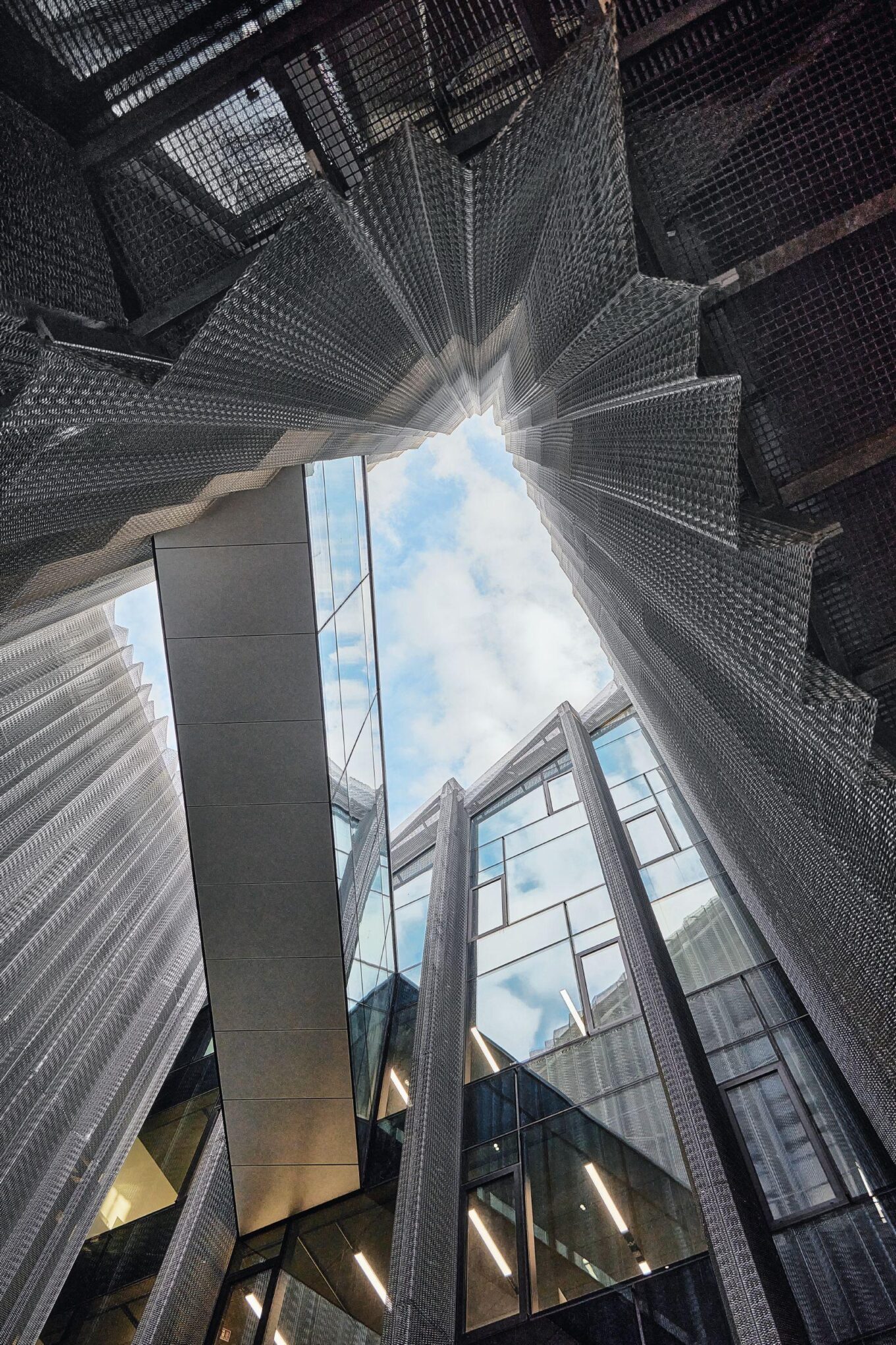 Фасад — справжній маніфест «нового індустріалізму»: агресивні об’єми, де складні кути та похилі площини ріжуть простір, приборкує алюмінієва сітчаста «шкіра». Ця інженерна оболонка не приховує конструкцію: сталевий екзоскелет, розроблений Arup, стає видимою опорою, демонструючи, як великі прольоти ігнорують традиційні обмеження. Похилий дах оптимізує природне освітлення з півночі й інтегрує фотоелектричні панелі потужністю 3 МВт, доповнені геотермальними тепловими насосами та радіантними стелями, роблячи будівлю зразком низьковуглецевої автономії із сертифікатом Nearly Zero Energy Building.