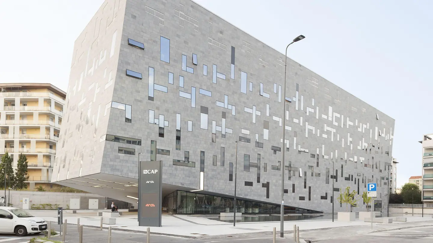 Gruppo CAP — це компанія, що забезпечує водою Мілан. Розроблений студією Claudio Lucchin & Architetti Associati об’єкт, завершений у 2023 році, консолідує офіси та сервіси в єдине цілісне тіло, що пливе над міським ландшафтом, ніби уособлення стабільності та плинності води, якою керує компанія. Масивність не є грубою, вона технологічна та виважена. Видимі вузли, кріплення й тримальні ферми перетворюються на естетичні акценти. Горизонтальні ламелі на південному фасаді, розташовані з математичною точністю, мінімізують літнє сонячне навантаження й додають динаміки.