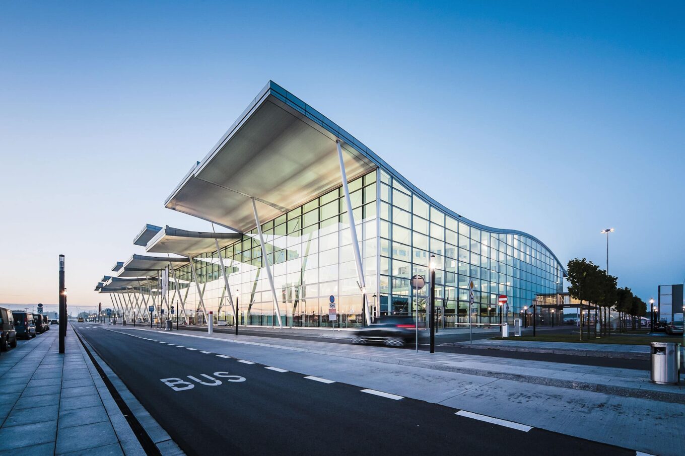 Основные элементы терминала, формирующие его архитектуру, выполнены в виде легкой стальной конструкции — крыша на изогнутых балках покрыта профилированным алюминиевым листом. В остеклении аэропорта применены оконные системы Reynaers Concept System 77, а также фасадные системы Curtain Wall 50 и 60, каждая из которых обладает свойствами, позволяющими в точности реализовать визуальный замысел проекта. Так, например, алюминиевые фасадные профили CW 60 предусматривают установку больших и тяжелых стеклопакетов весом до 450 кг. Система подходит для строительства наклонных и изогнутых фасадов — именно эти конструктивные возможности остекления были необходимы для возведения аэропорта имени Коперника. Все системы Reynaers на выходе из производства проходят проверки на теплоизоляцию, герметичность и устойчивость к ветровым нагрузкам — как раз эти качества материалов принципиально важны в реализации крупных объектов транзитной архитектуры.