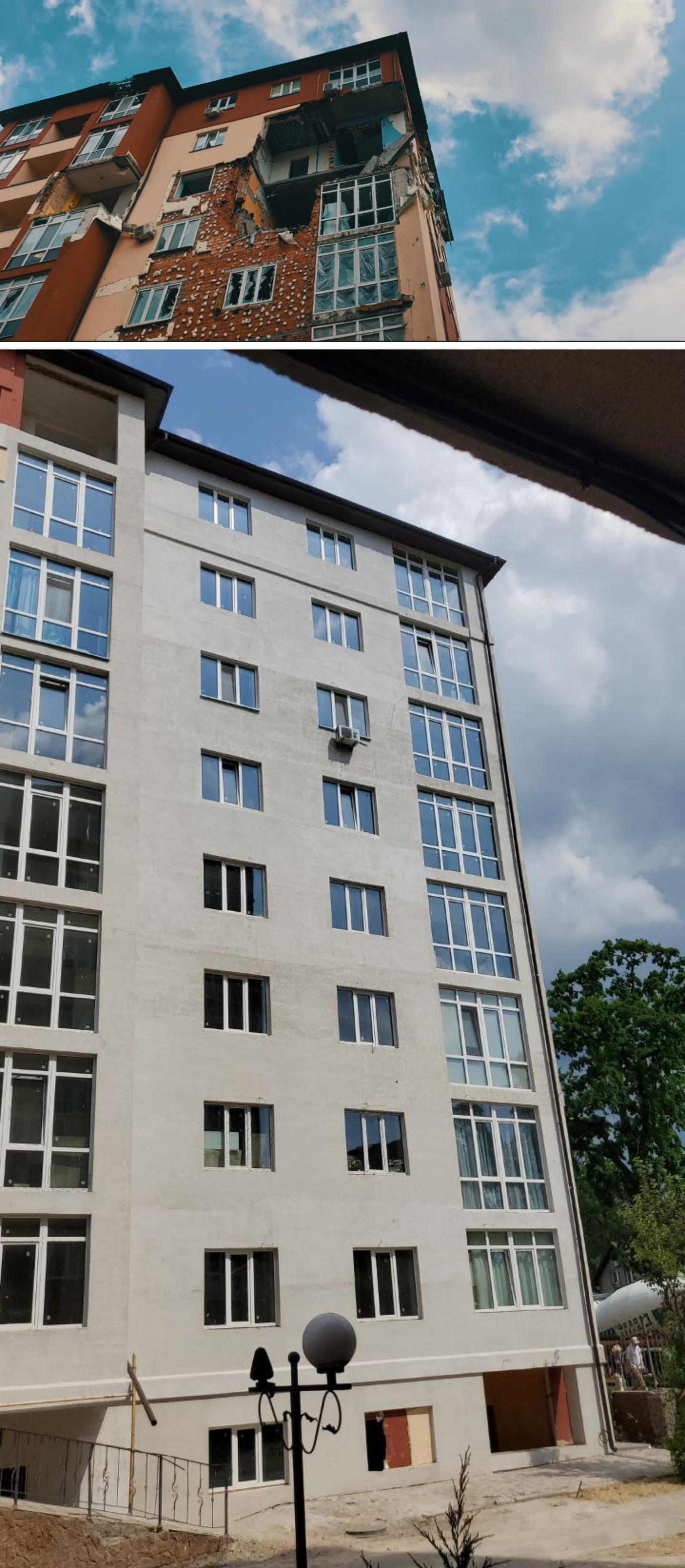 Олексій розповів про перші проєкти студії після початку повномасштабної війни. Першим став будинок в Ірпені, в який влучила ракета. Будівлю було пошкоджено, але верхні поверхи лишилися й нависали над вулицею — будинок був у дуже аварійному стані.