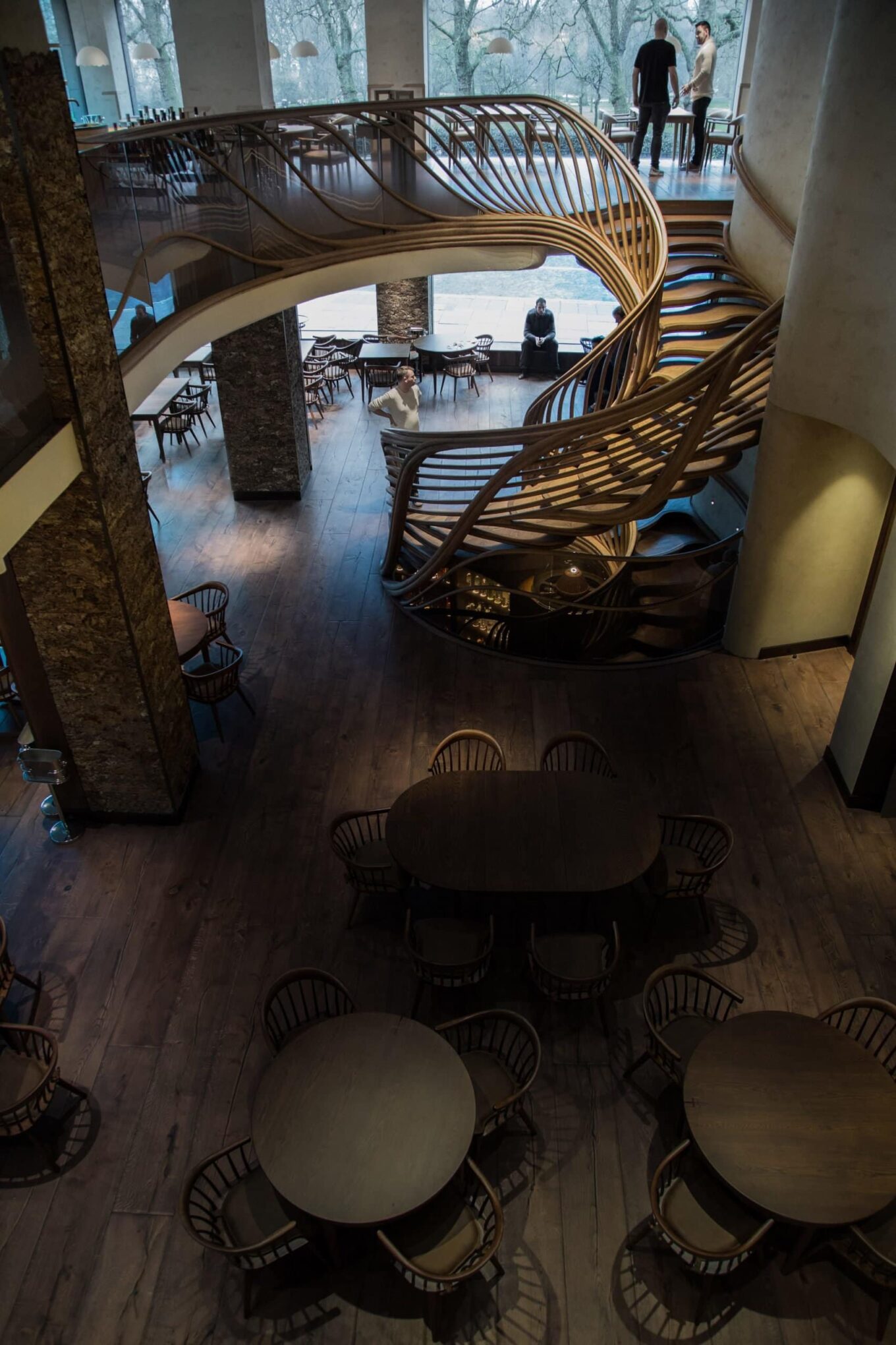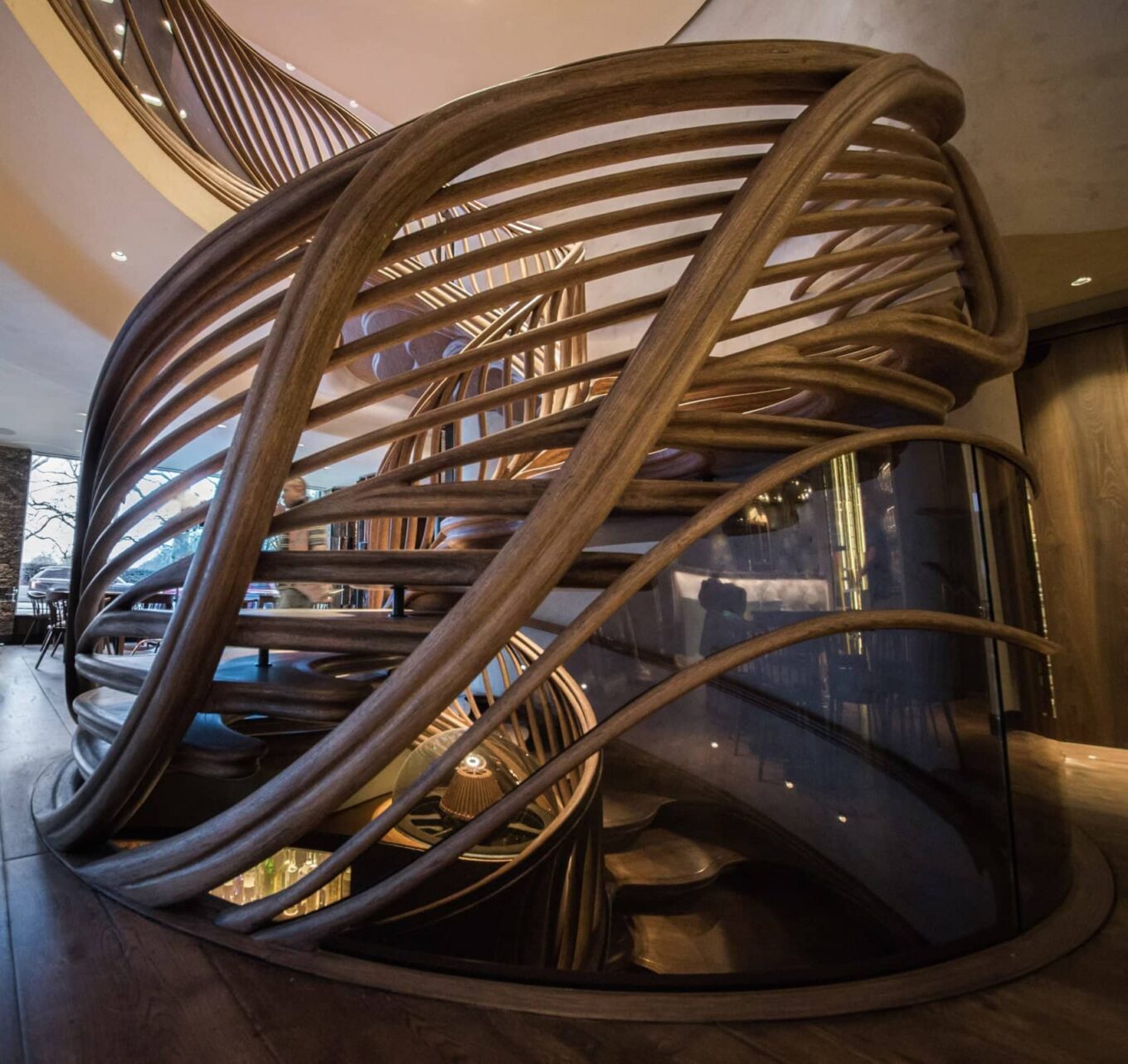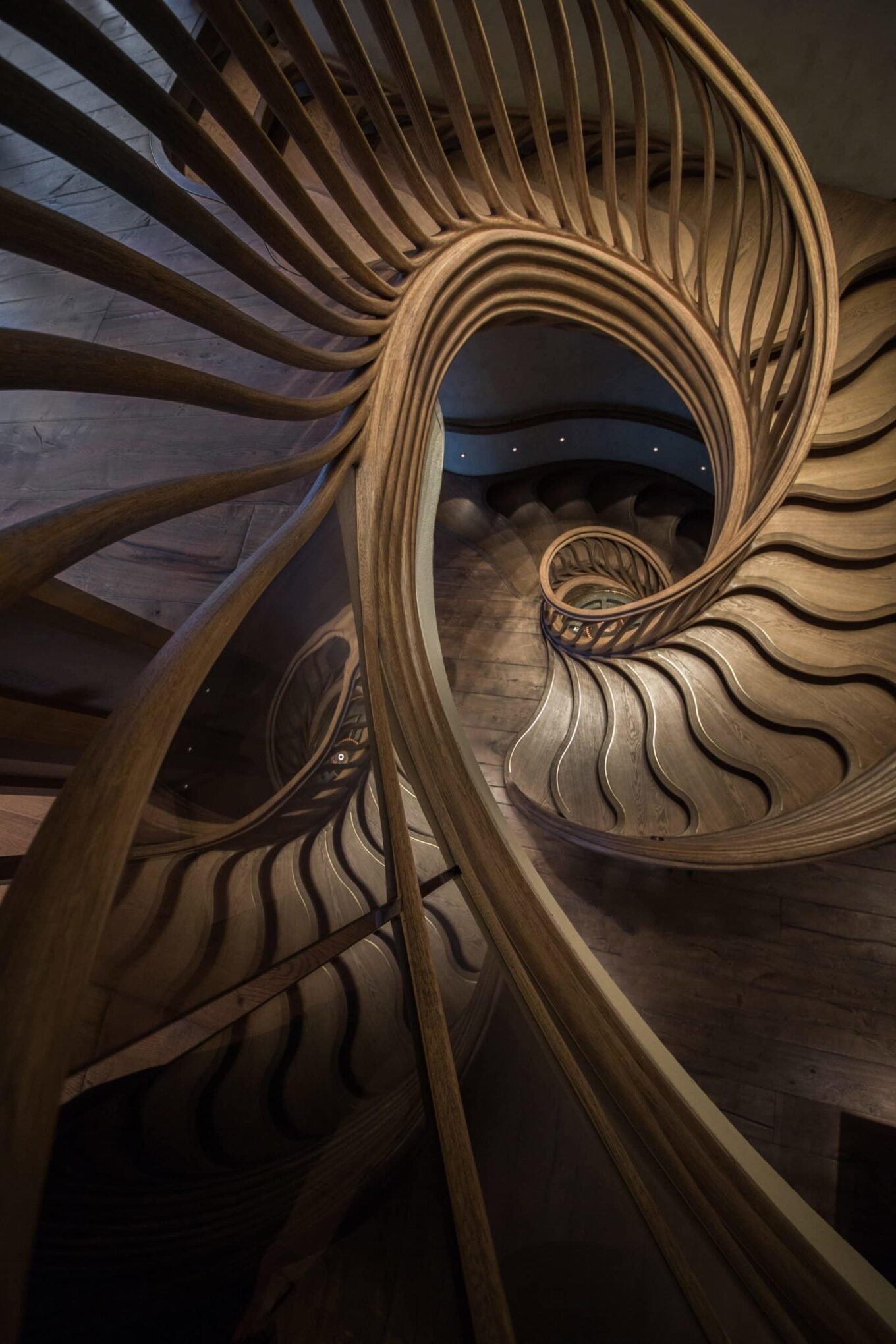 Создавая центральную лестницу для HIDE, художники Atmos studio, известные своими экспериментами с растительными формами, выбрали в качестве прототипа образ мощной древовидной лианы: «Она стремится вверх, энергично вращается, как штопор, ступени разворачиваются от структурного стебля, словно листья, а тонкие ветви образуют тонкую волнистую балюстраду, аккуратно направляющую гостей».