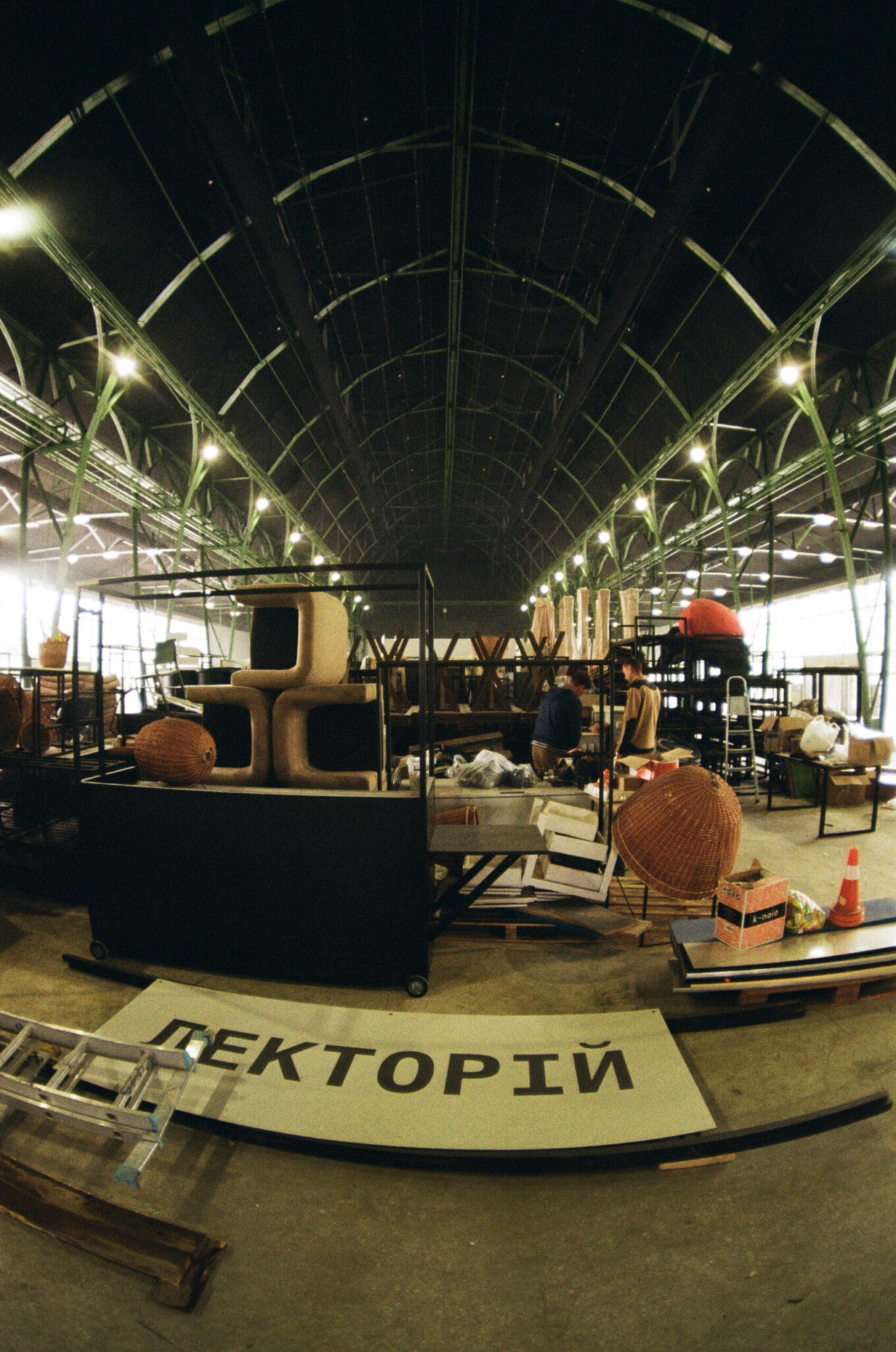 О. П.: Коли ми вперше потрапили в будівлю, зсередини вона була повністю зашита тканинами, гіпсокартоном, ми не бачили конструкцій, уся будівля була розбита на три окремих блоки, вони візуально відокремлювались перестінками. І це все накопичилось і перетворилось на якусь псевдоархітектуру. Тож ми почали з того, що повністю очистили цей простір. Коли все прибрали, то побачили, що, окрім металевих ферм, які підтримують дах, у павільйоні фактично більше нічого немає — чистий open space. Побачивши цей неймовірний простір, ці металеві ферми, ми дійшли до розуміння, що тут треба максимально залишати все таким, як було із самого початку. Якщо говорити про якийсь дизайн, то його тут практично немає.