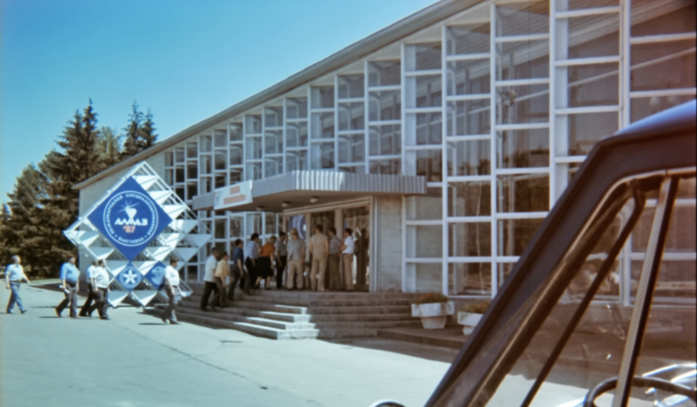 Фасадні системи павільйону, добудовані у 80-х роках. Зображення: рекламний ролик про виробництво штучних алмазів, Центрнаукфільм, 1987 рік
