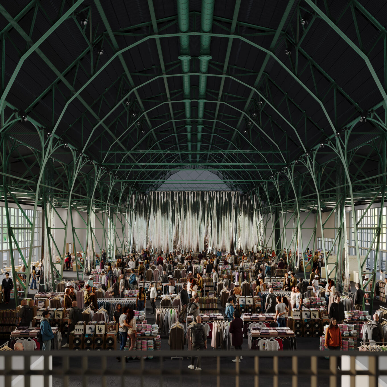 Візуалізація маркету «Кураж» в оновленому павільйоні КИТ. Один з найбільш виразних елементів простору — «ферми», пофарбовані у колір «ODOT Green». Джерело зображення: архітектурне бюро «ФОРМА»