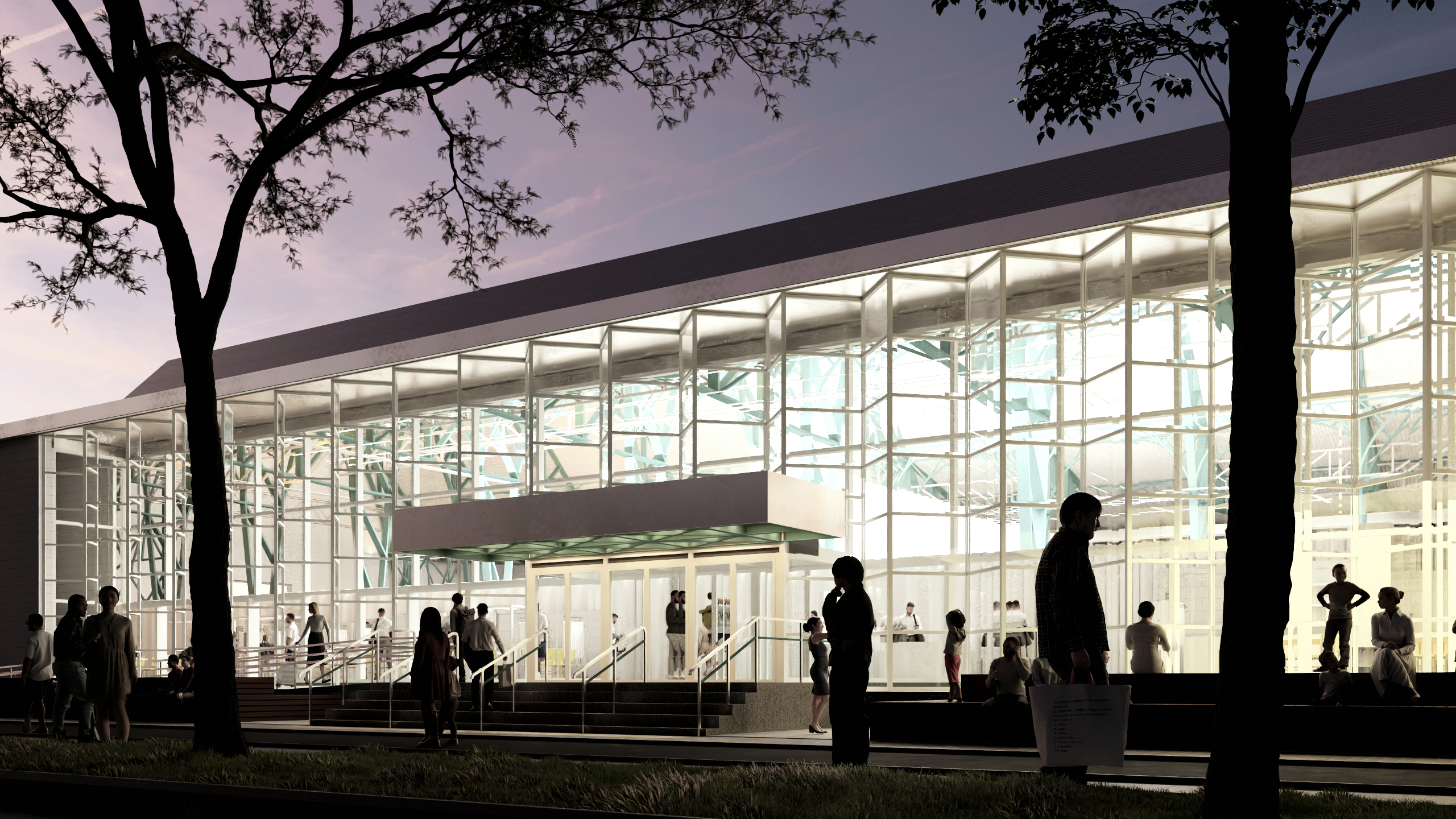 Візуалізація фасадних систем павільйону КИТ після ревіталізації у вечірній час. Джерело зображення: архітектурне бюро «ФОРМА»