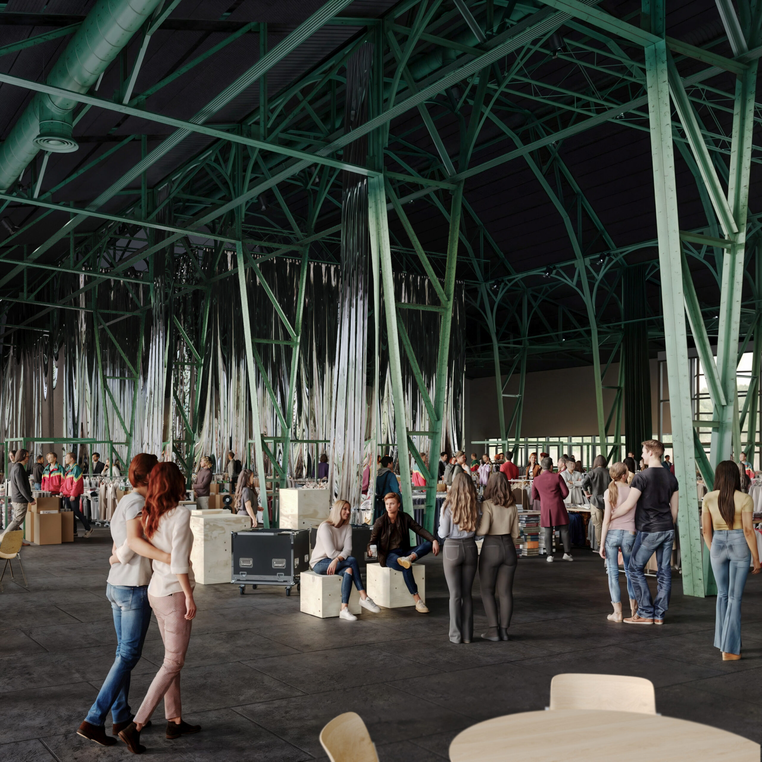 Візуалізація маркету «Кураж» в оновленому павільйоні КИТ. Один з найбільш виразних елементів простору — «ферми», пофарбовані у колір «ODOT Green». Джерело зображення: архітектурне бюро «ФОРМА»