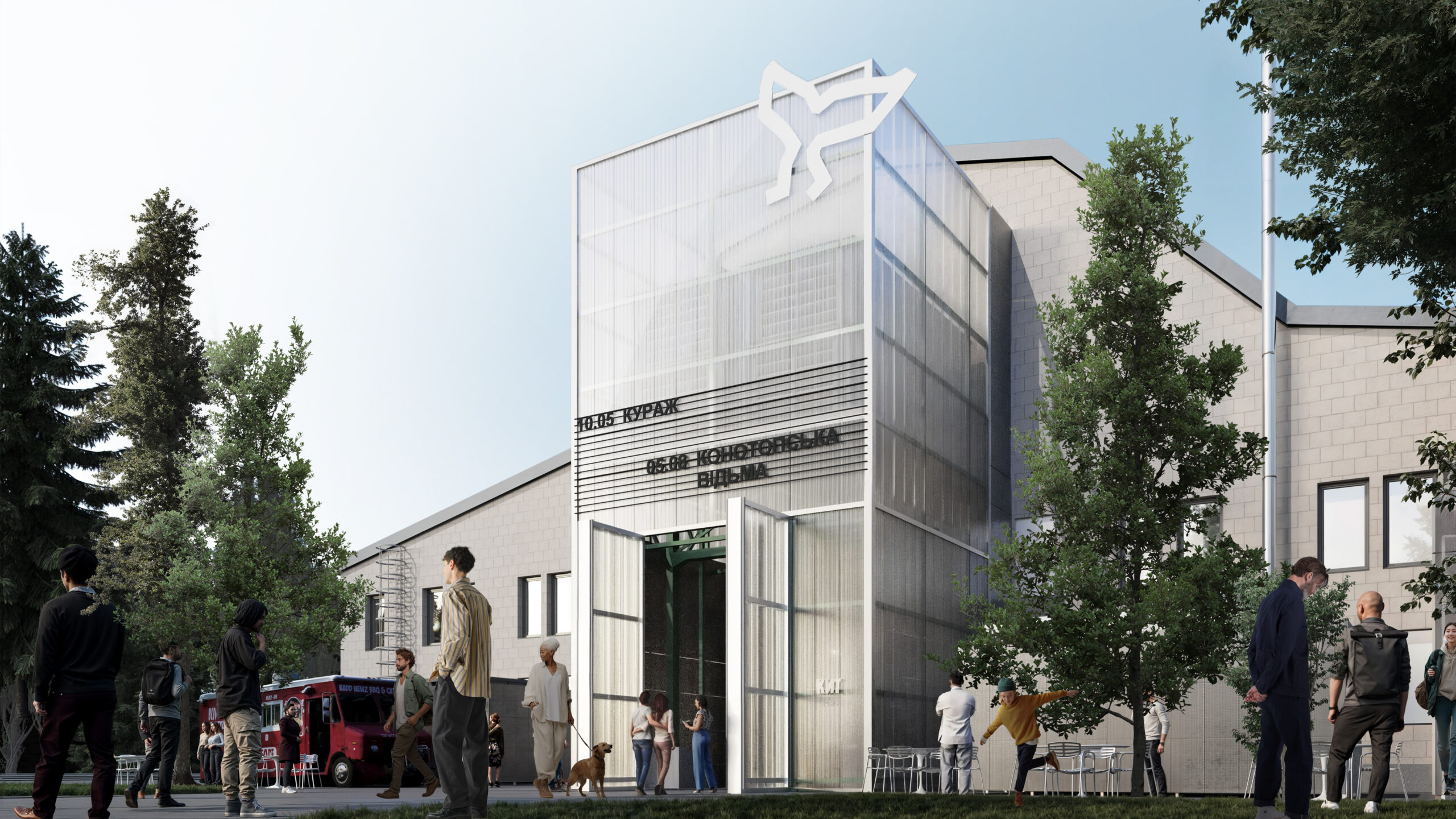 Візуалізація входу до павільйону КИТ із торцевого боку, на зображенні — вигляд після усіх етапів модернізації будівлі. Джерело зображення: архітектурне бюро «ФОРМА»
