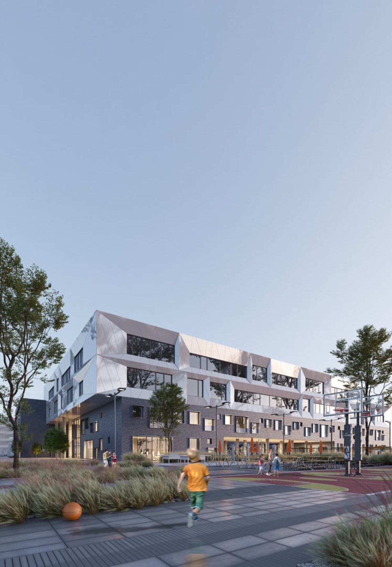 Первый эскизный вариант проектного предложения школы “А+” в ЖК “Файна Таун” от компании archimatika. Источник изображения ©archimatika