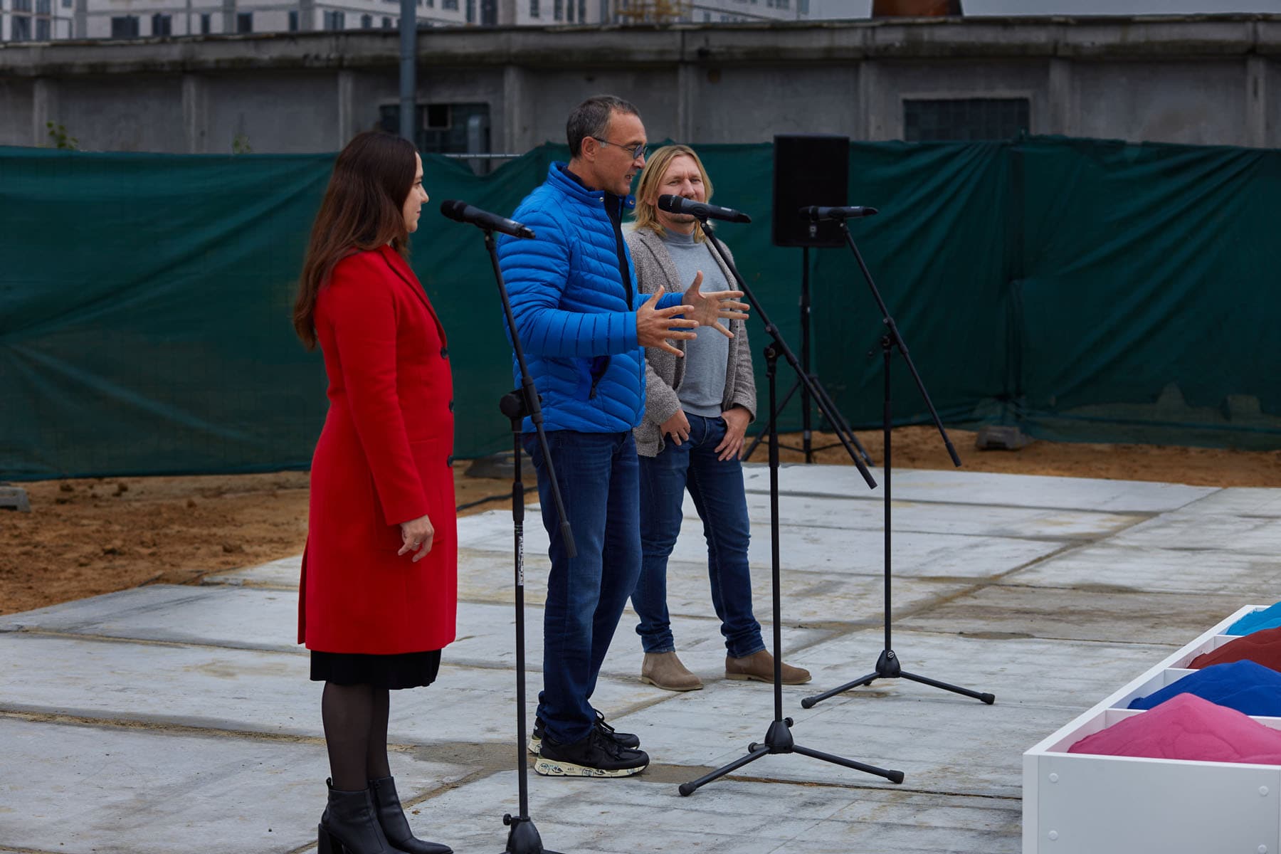 Генеральный директор сети «А+» Татьяна Курмаз, руководитель KAN Игорь Никонов и соучредитель, главный архитектор компании archimatika Дмитрий Васильев на торжественной закладке первого камня будущей школы “А+” в ЖК “Файна Таун”