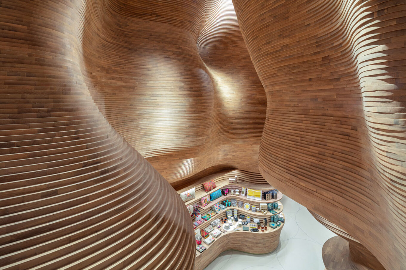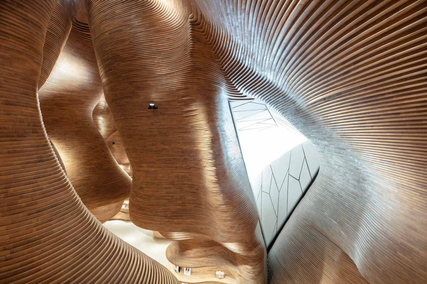Скульптурные волнистые стены, сформированные из более чем 40 тысяч деревянных фрагментов имитируют пространства пещеры Даль Аль Мисфира, или, как ее еще называют «Пещеры Света».