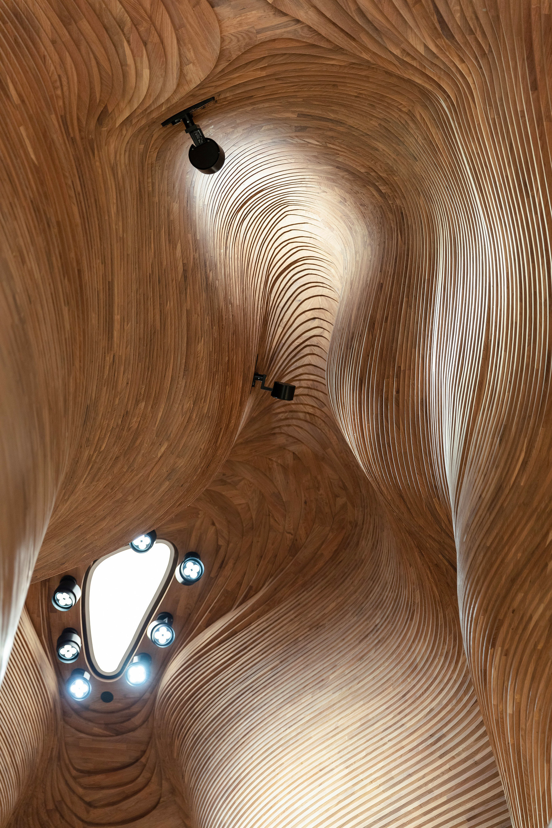 Скульптурные волнистые стены, сформированные из более чем 40 тысяч деревянных фрагментов имитируют пространства пещеры Даль Аль Мисфира, или, как ее еще называют «Пещеры Света».
