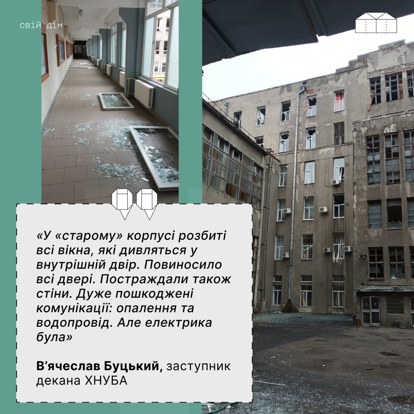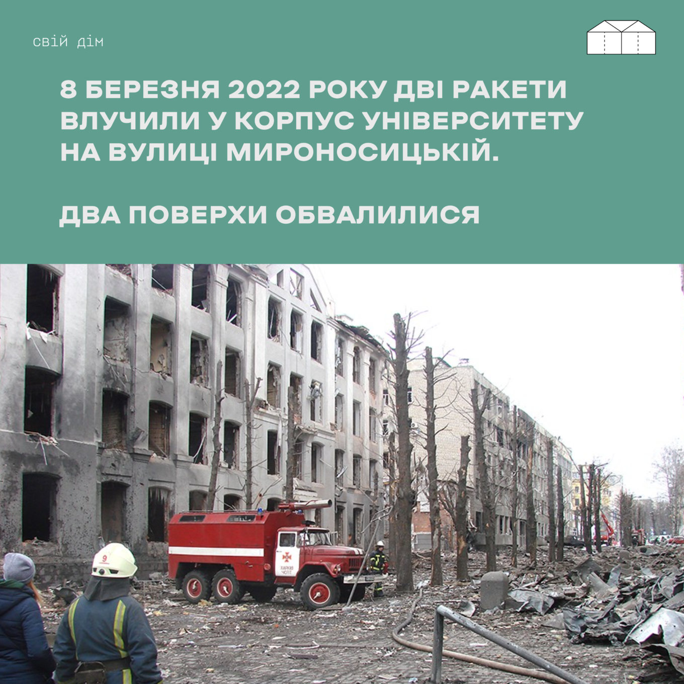 „2 marca nie doszło do bezpośredniego trafienia w budynki uniwersytetu. Jednak okna i drzwi pobliskiego budynku SBU zostały wysadzone przez loty. A 8 marca doszło do kolejnego ostrzału. Potem było dwóch przybyszów do tak zwanego nowego budynku na Myronositskiej. Zawaliły się dwa piętra” – powiedział platformie „Swoi Dim” dziekan Wiaczesław Butskij.