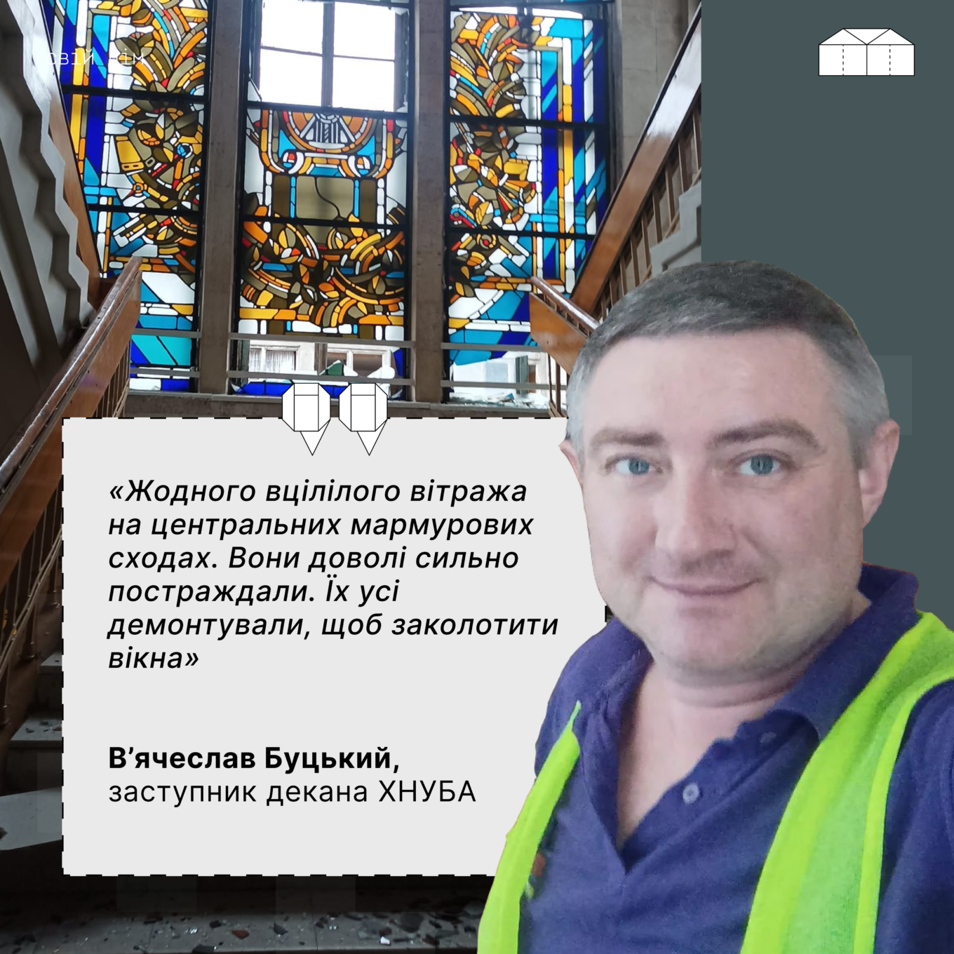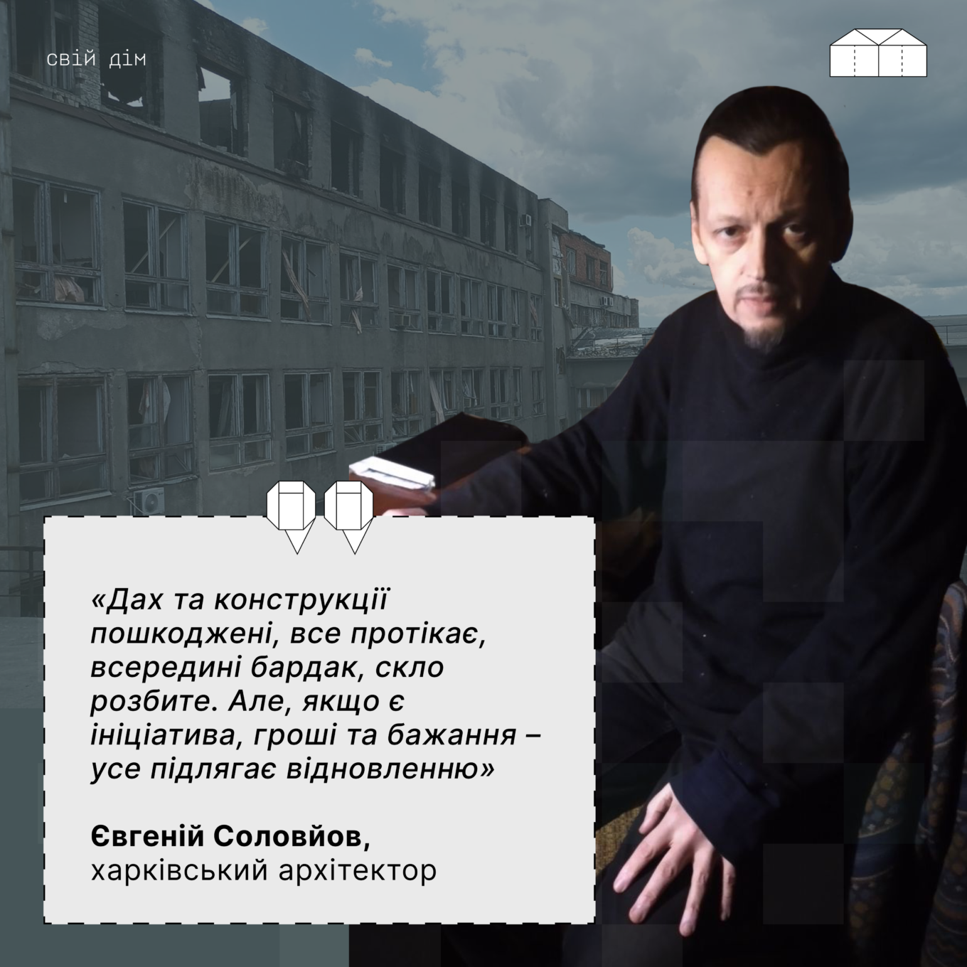 „Dach i konstrukcje są uszkodzone, wszystko przecieka, wewnątrz panuje bałagan, szkło jest potłuczone. Ale budynek na Myronositskiej stoi, więc nie można powiedzieć, że wszystko bezpowrotnie stracone, trzeba go zburzyć i zbudować nowy. Jeśli będzie inicjatywa, pieniądze i chęci, wszystko da się przywrócić” – zapewnia Jewhenii Sołowjow.