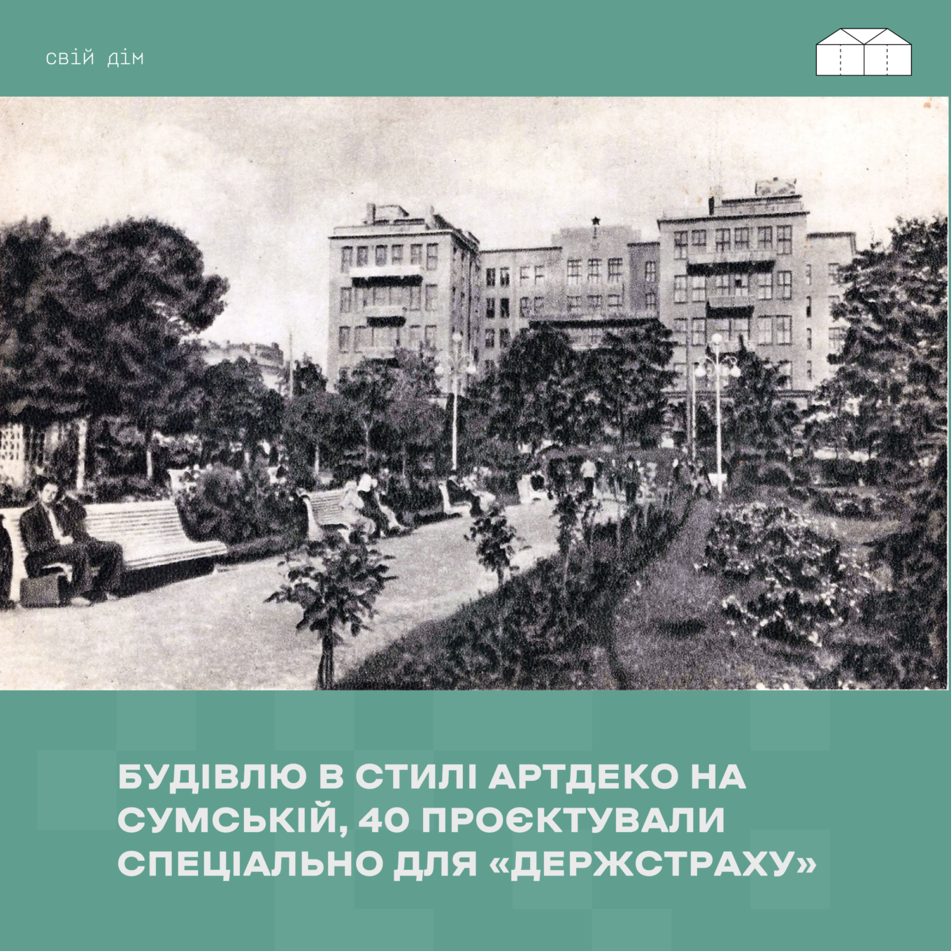 Budynek w stylu Art Deco przy ulicy Sumskiej 40 został zaprojektowany przez Oleksandra Mołokina we współpracy z innym architektem, Gieorgijem Ikonnikowem, specjalnie dla Derżstracha. Jednak po drugiej wojnie światowej Charkowski Instytut Inżynierii i Budownictwa (obecnie Charkowski Narodowy Uniwersytet Budownictwa i Architektury) przeniósł się w to miejsce, ponieważ jego budynek został zniszczony. W latach 1960. XX w. na dziedzińcu dobudowano parterowy hol. Później w pobliżu powstały jeszcze dwa budynki uniwersytetu.