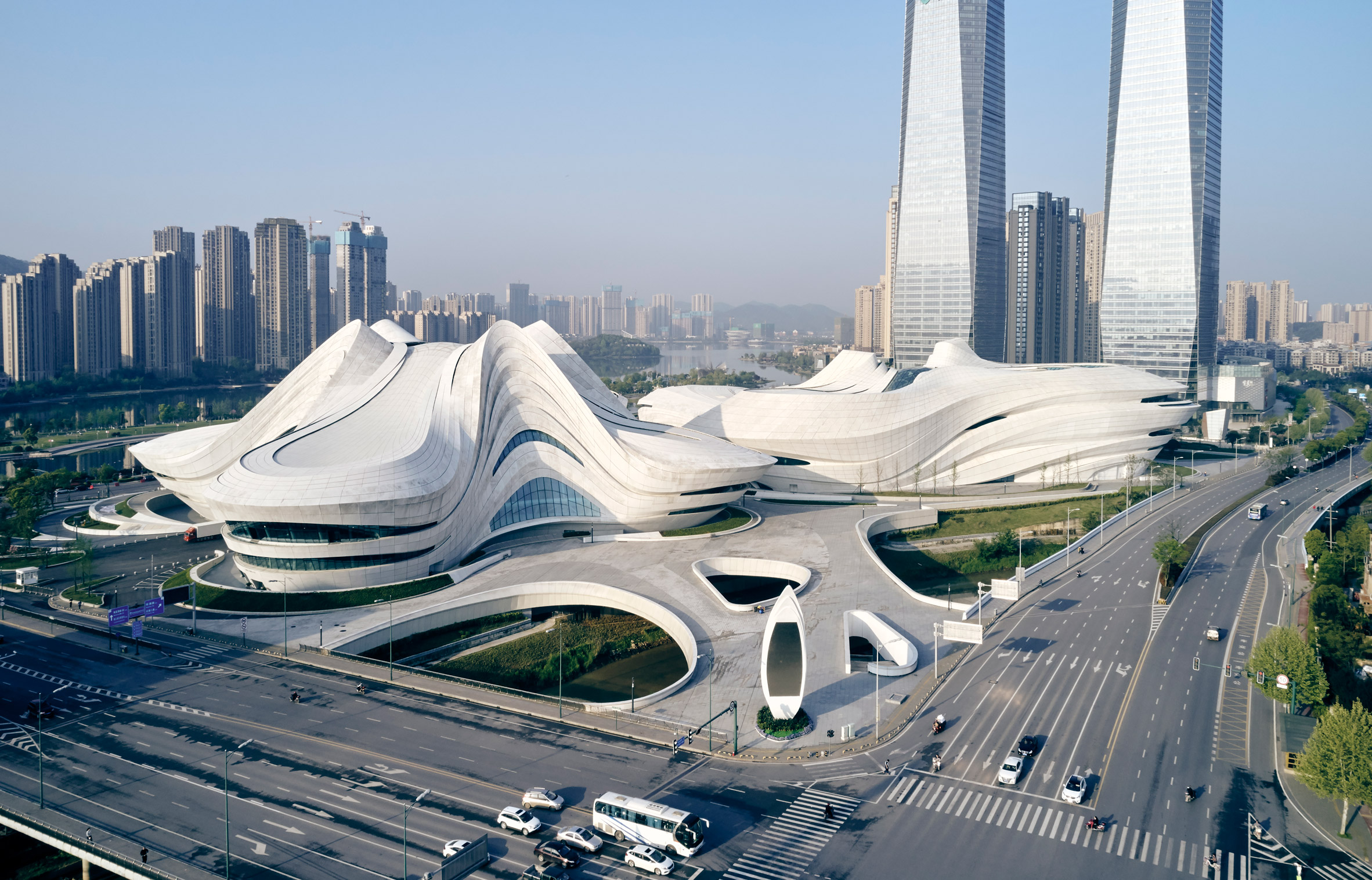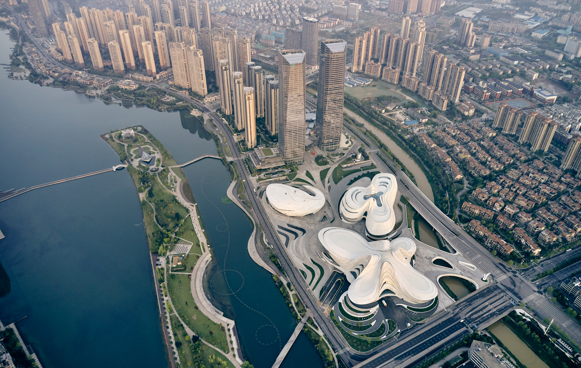 А вот план участка претерпел существенные изменения. Первоначально планировалось уравновесить комплекс в Чанша группой высотных коммерческих зданий веретенообразной формы, которые смотрелись бы органичным продолжением биоморфных конструкций музея и театров. Но, как мы видим, на их месте возведены две массивные башни в виде строгих кристаллов.