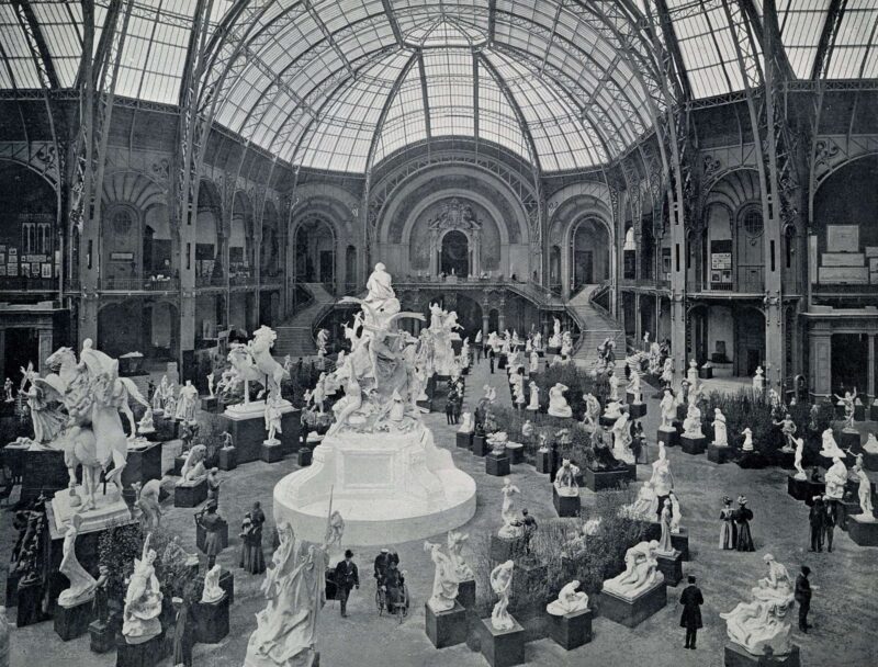 Гран-Пале был построен ко Всемирной выставке 1900 года, как следует из надписи на фронтоне: «Воздвигнуто Республикой во славу французского искусства», и являлся самым крупным на тот момент выставочным пространством на планете. Над созданием дворца под руководством архитектора Чарльза Жиро работали еще три французских архитектора – Анри Деглейн (занимался проектированием главного фасада), Альберт Луве (проектировал среднюю часть здания и Salon d’Honneur ), Альбер Томас (проект Palais de la Decouverte).
