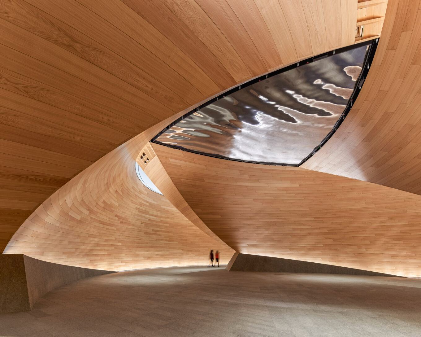 Автор: Джеймс Ньютон. Категория: «Интерьер». Установка художника Олафура Элиассона The Vortex — одно из нескольких произведений современного искусства, интегрированных в структуру архитектуры офиса Bloomberg от Foster + Partners. Фрагмент из полированного металла на потолке выглядит как опрокинутый водоем в окружении метафорического вихря классических деревянных панелей.
