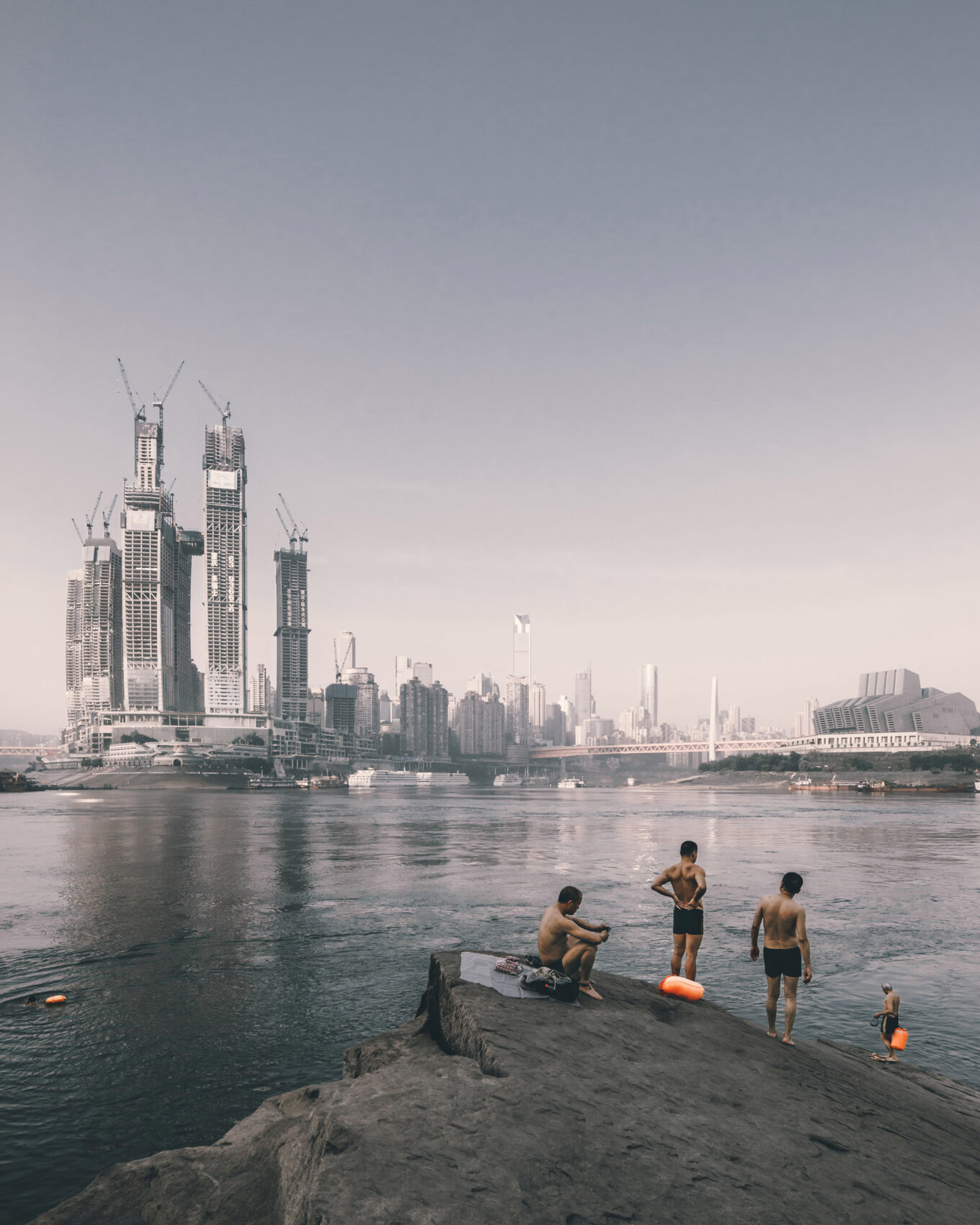 Автор: Чжу Вэньцяо. Категория: «Чувство места». Фотограф запечатлел купальщиков на фоне строящегося делового центра Raffles в городе Чунцин. Проект Raffles City Chongqing создан архитектором Моше Сафди.