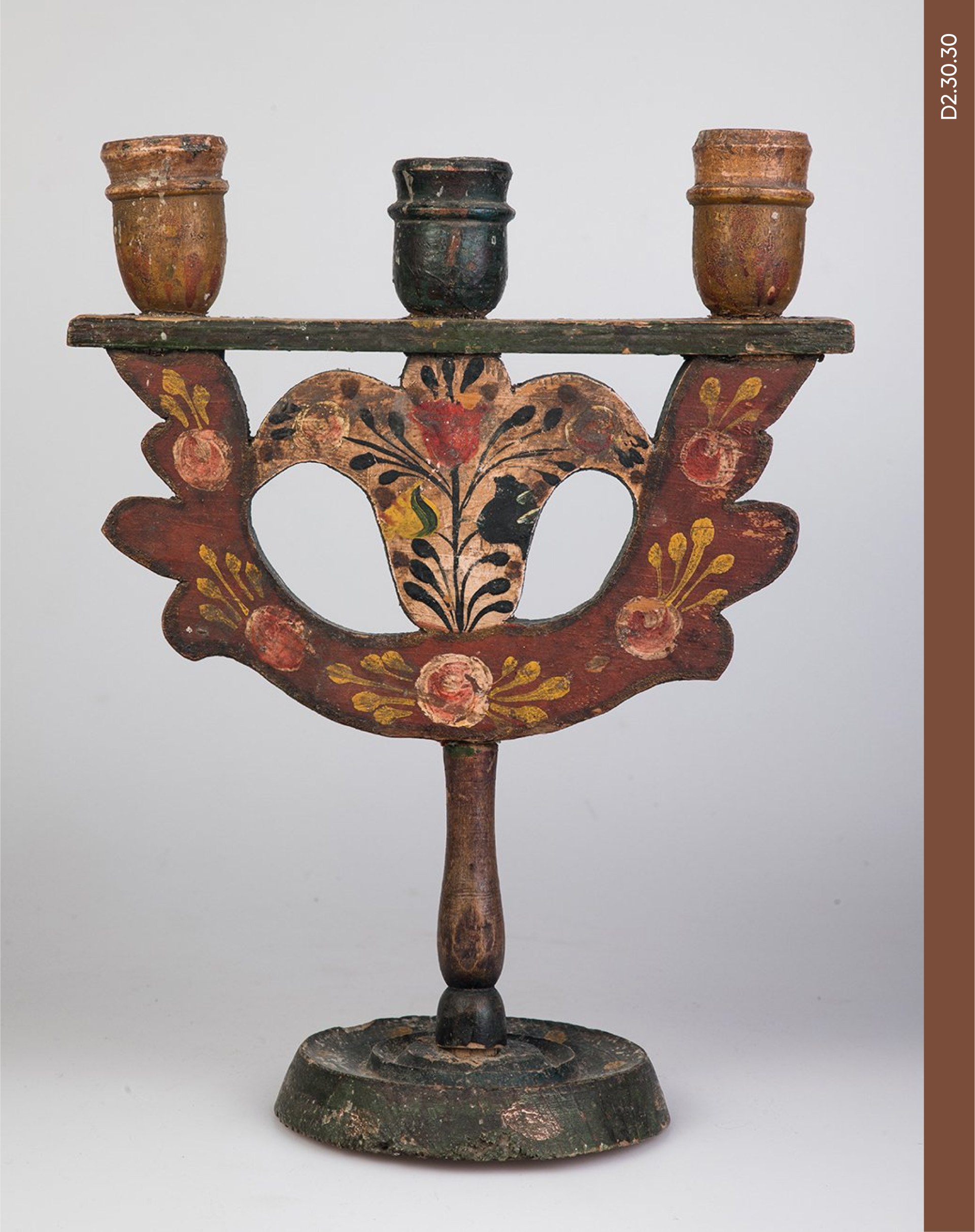 Свічник-трійця, Івано-Франківська обл., кін. ХІХ ст. Дерево, фарби, вирізування, токарна техніка, столярна техніка, розпис. Колекція Музею Івана Гончара
