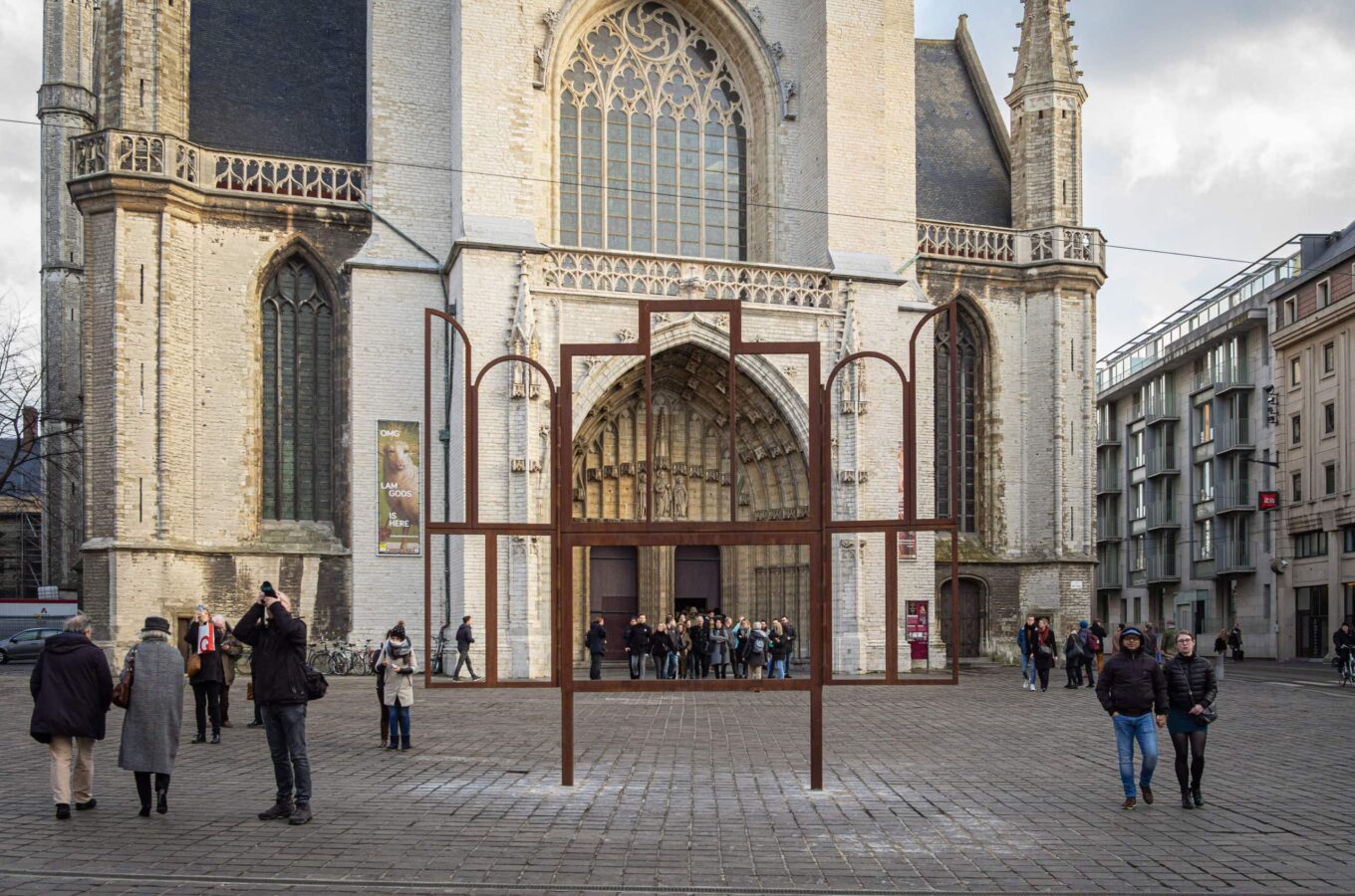 Перед собором знаходиться інсталяція художника Кріса Мартіна, яка відтворює форми Гентського вівтаря. © Storm Calle