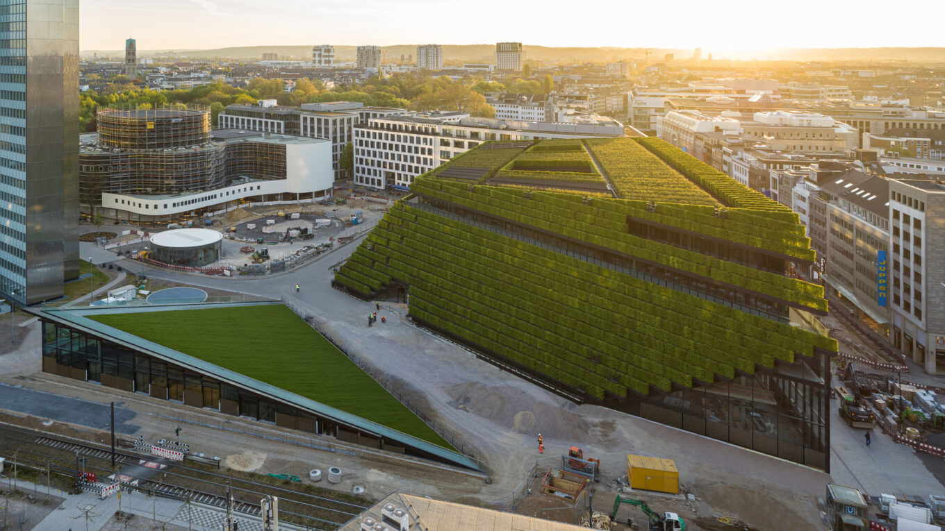 Стрижені граби утворюють зелений фасад будівлі Kö-Bogen II, спроєктованої Ingenhoven Architects. Дюссельдорф, Німеччина. Фото: © Hans Georg Esc