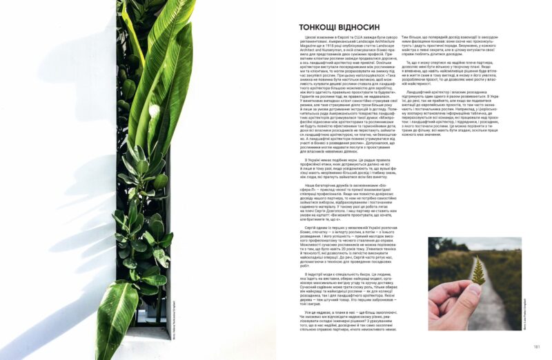 Тісне співробітництво з виробниками рослин дозволяє вигравати обом сторонам. Нам пощастило з нашими локальними партнерами, Сергієм і Тетяною Довгополами, засновниками розсадника «Біосфера-Л». Ми співпрацюємо на таких великих столичних проєктах, як ЖК «Метрополіс», ЖК Park Lake City, ЖК «Автограф», озеленюємо території багатьох котеджних містечок, ділимося інформацією та будуємо спільні плани на майбутнє.