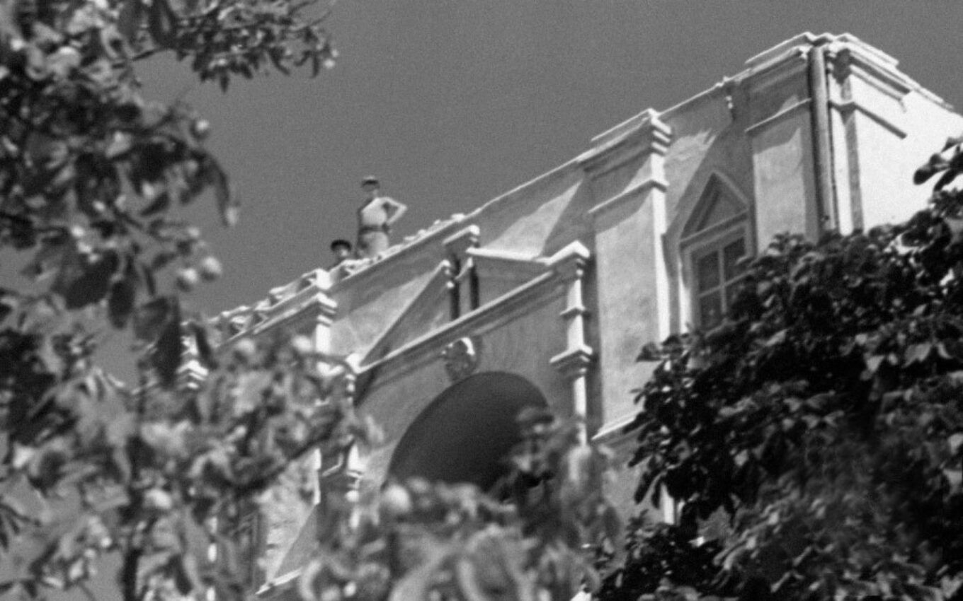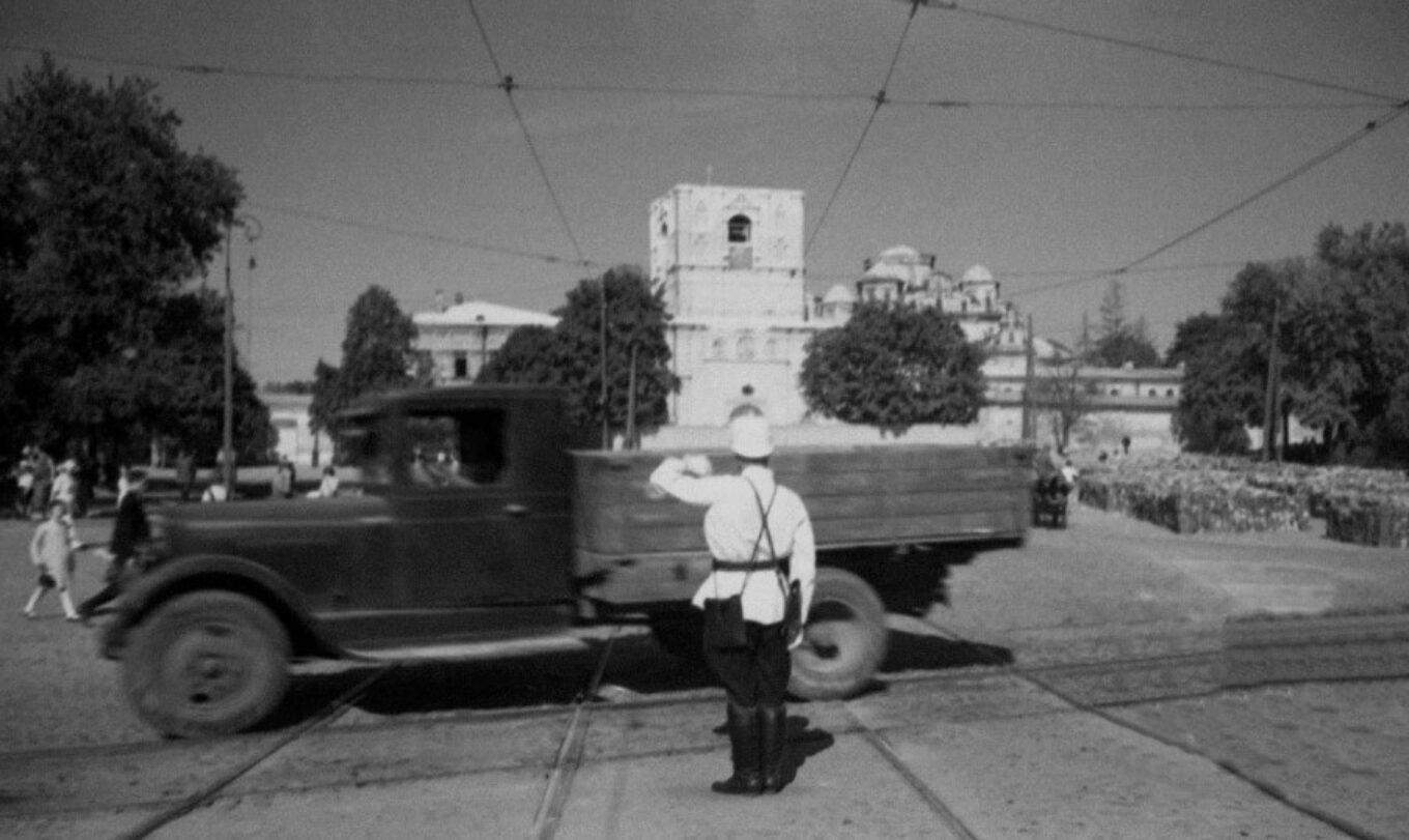 Момент розбирання дзвіниці Михайлівського монастиря, який у 1936 році зняв американець Julien Bryan. Джерело зображення: kyivpastfuture.com.ua