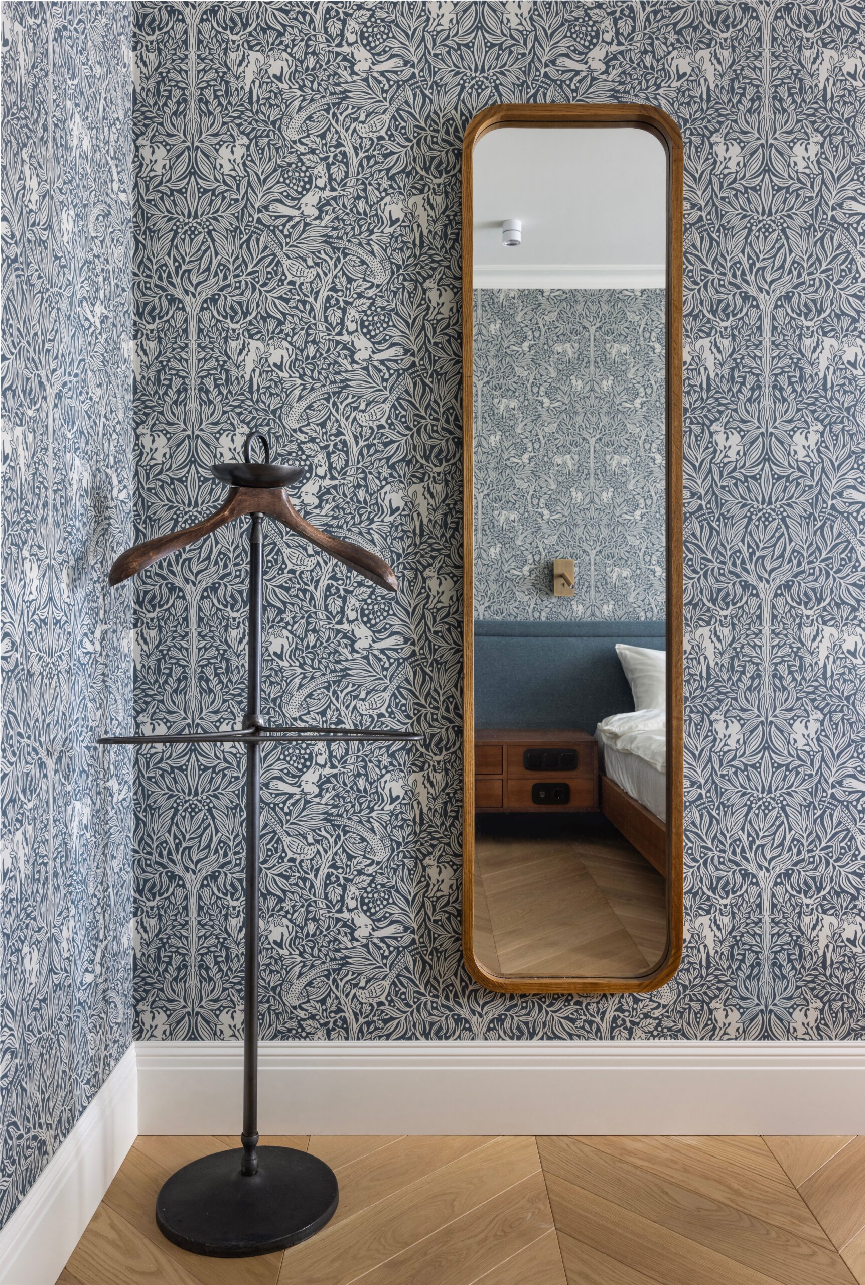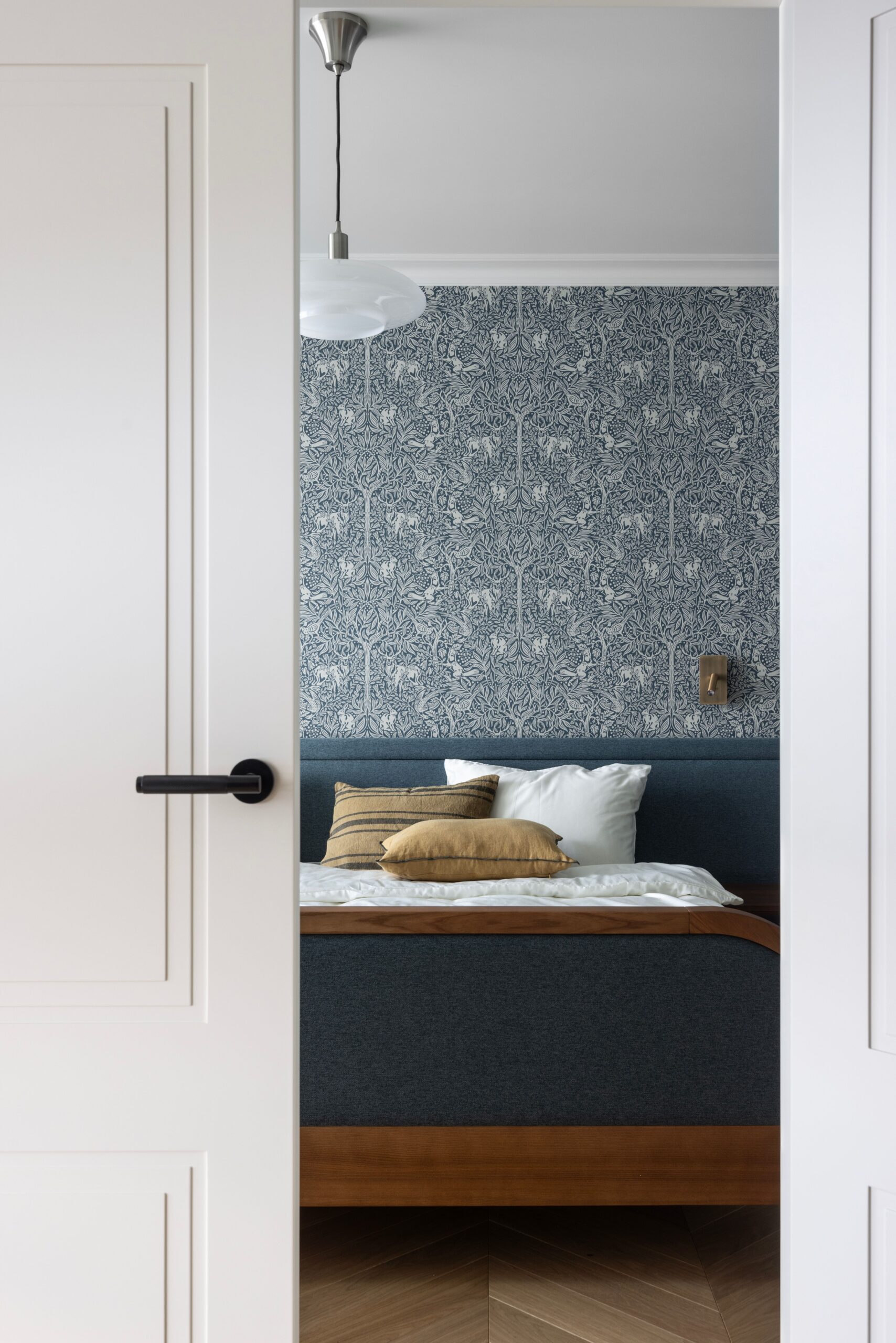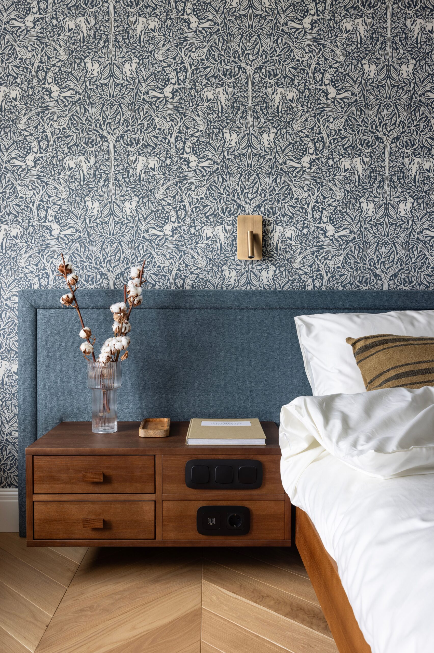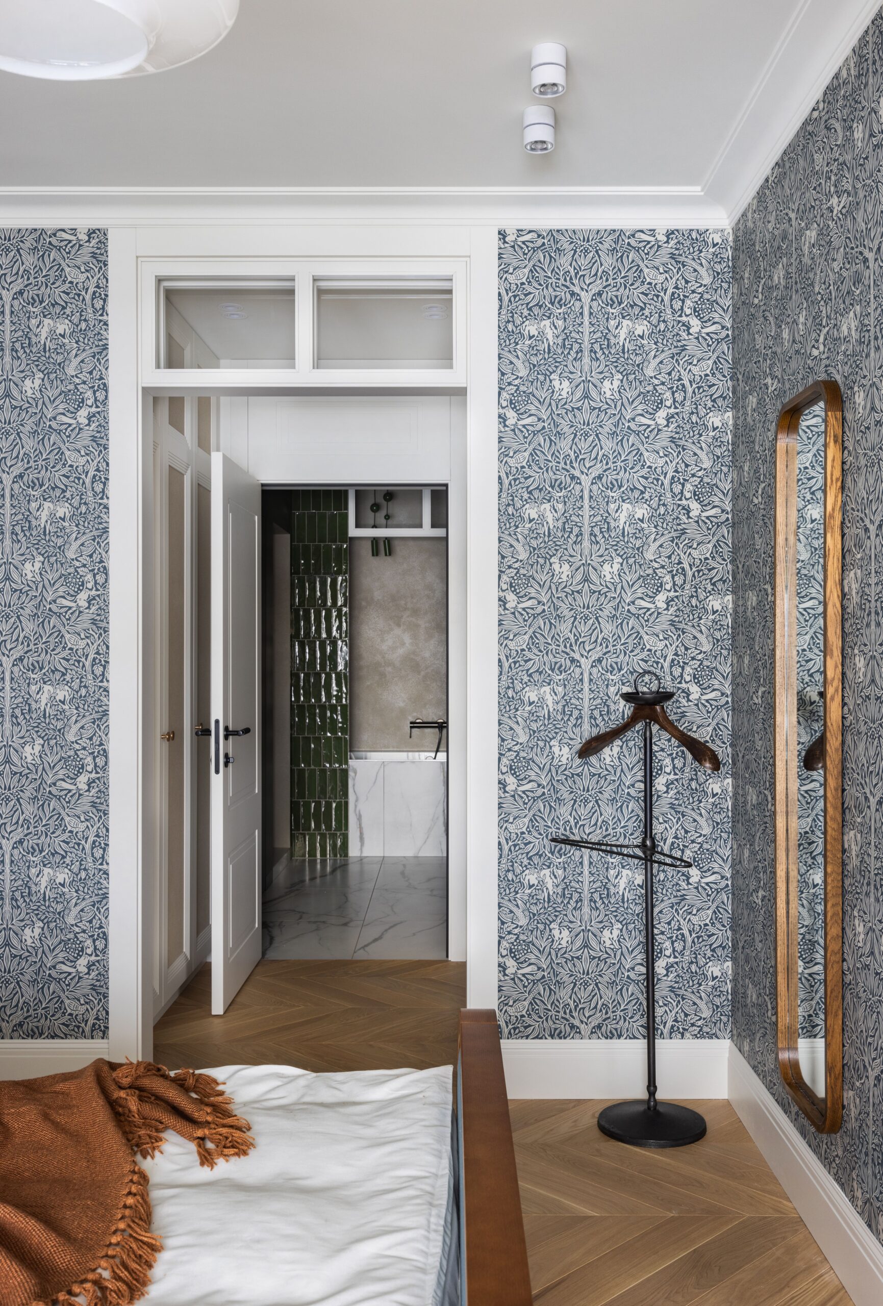 Найбільш виразними стали кольорові акценти у батьківському блоці. У спальні використали шпалери шведського бренду Borastapeter із блакитним орнаментом, які контрастують із насиченим зеленим відтінком стін у кабінеті. Двері між цими кімнатами переважно відкриті, що дозволяє бачити обидва кольори водночас.